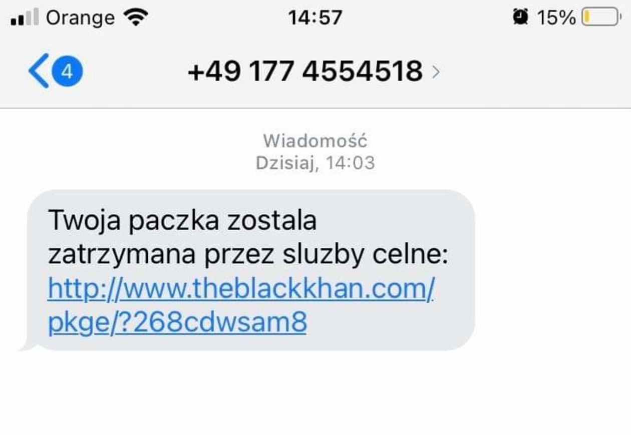 Krajowa Administracja Skarbowa ostrzega przed fałszywymi SMS-ami o paczce zatrzymanej przez „służby celne”. Takie wiadomości mogą zawierać link do strony, która ma na celu wyłudzenie pieniędzy.