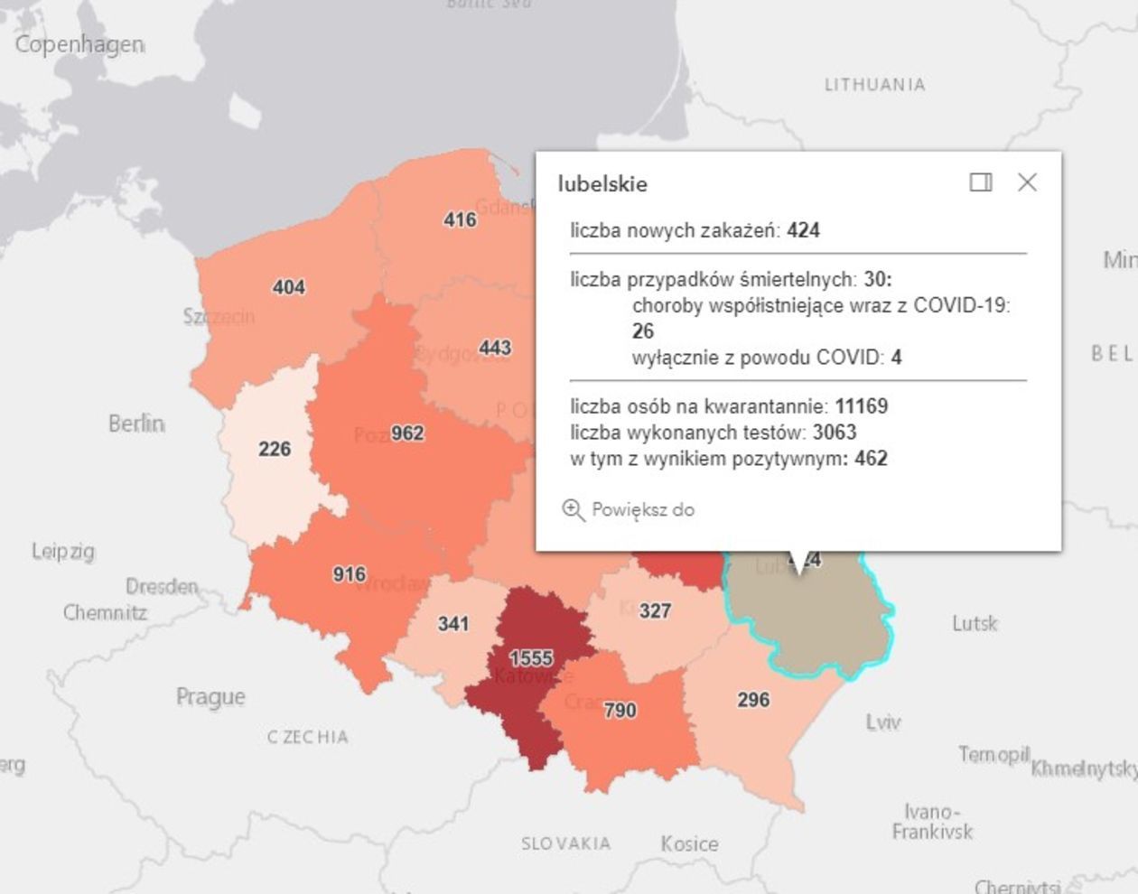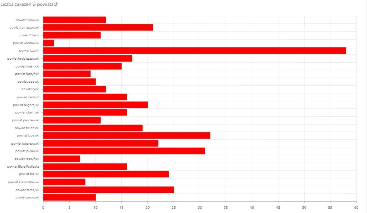Najwięcej nowych zakażeń wykryto w Lublinie (58) i powiecie lubelskim (32).