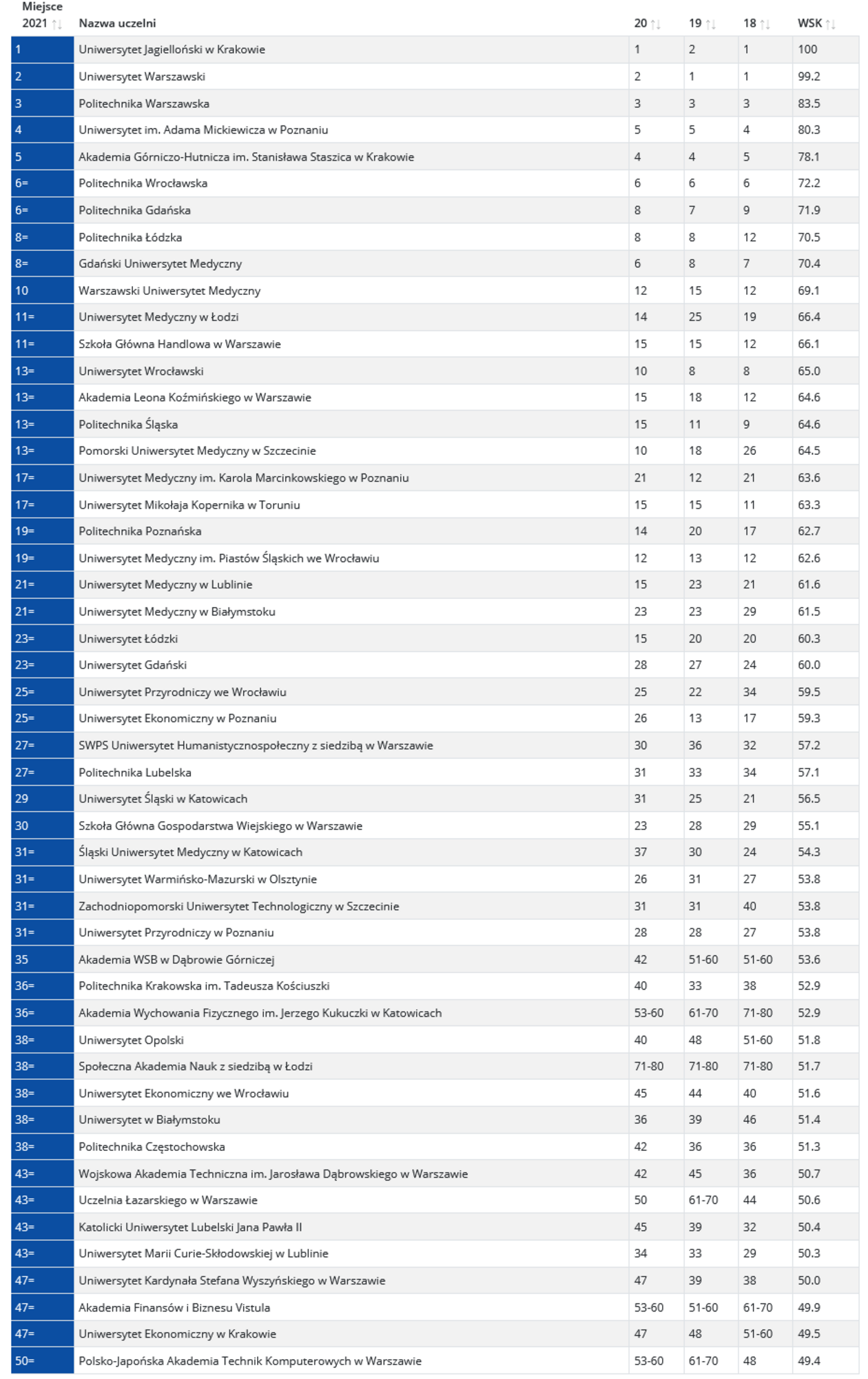 Zestawienie po raz 22. przygotowało Wydawnictwo Edukacyjne Perspektywy. W czołówce uczelni akademickich nie doszło do zmian. Liderem pozostaje Uniwersytet Jagielloński w Krakowie przed Uniwersytetem Warszawskim i Politechniką Warszawską. Do roszady doszło tuż za podium. Na czwarte miejsce awansował Uniwersytet im. Adama Mickiewicza w Poznaniu, który przegonił krakowską Akademię Górniczo-Hutniczą.