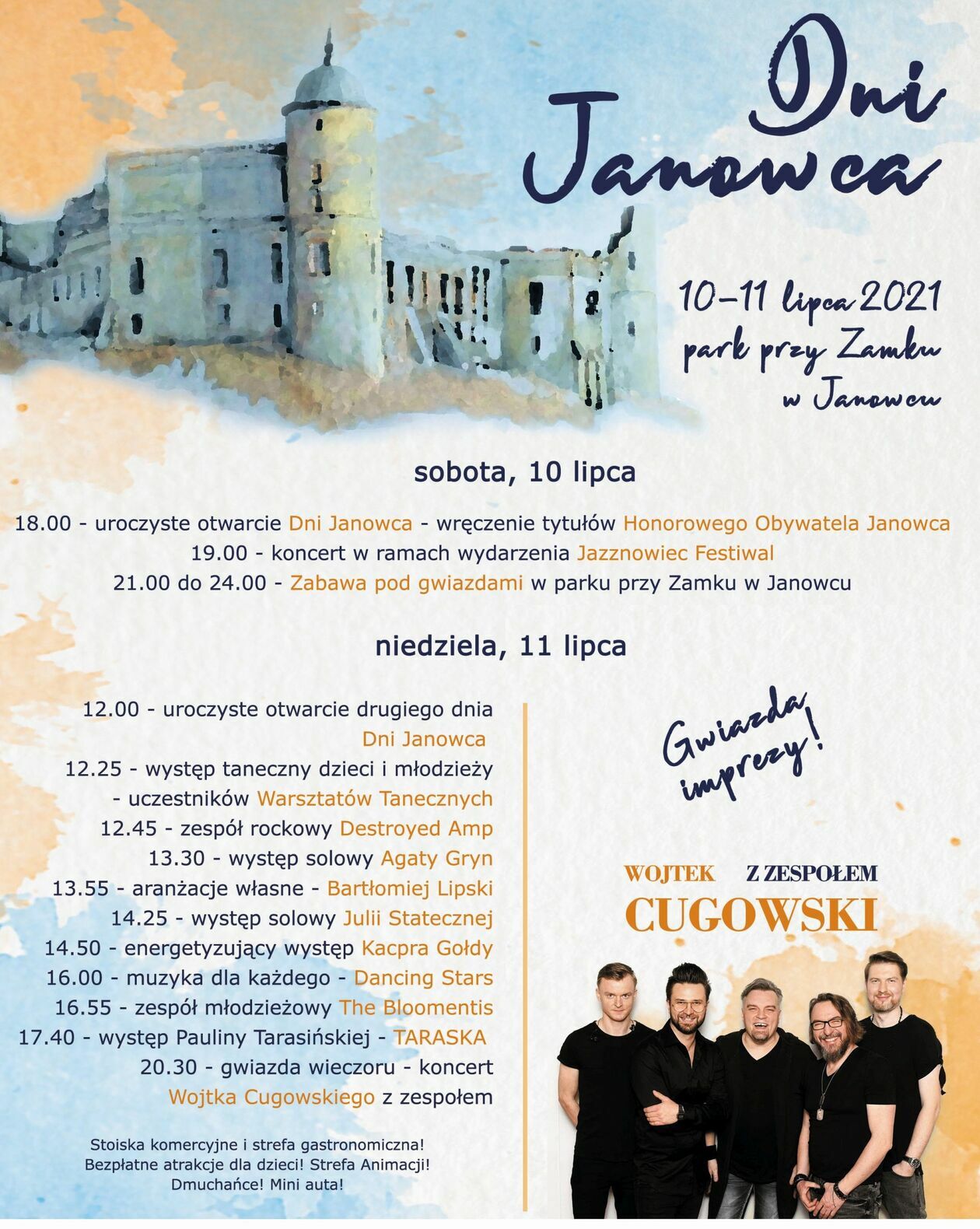 Wszystko oficjalnie rozpocznie się w sobotni wieczór (o godzinie 18) wręczeniem odznaczeń dla zasłużonych mieszkańców gminy. Godzinę później rozpocznie się otwarty koncert w ramach Jazznowiec Festiwal. W parku przy zamku, utwory Wojciecha Młynarskiego i Włodzimierza Nahornego zaśpiewają Agnieszka Wilczyńska i Janusz Szrom. Tuż po tym występie, zaplanowano taneczną „zabawę pod gwiazdami”, która potrwa do północy.