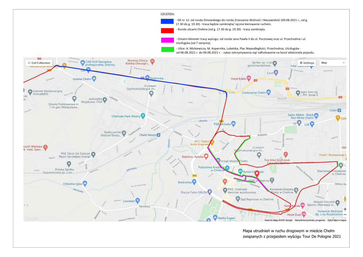 W samym dniu wyścigu w godzinach 17.30 – 19.30 całkowicie wyłączony z ruchu zostanie odcinek będący trasą przejazdu zawodników. W tym czasie policja i służby porządkowe będą kierować ruchem ręcznie. Kolarze wjadą do Chełma od ul. Zawadówka, a następnie przejadą przez rondo im. Romana Dmowskiego, ul. Rejowiecką, wiadukt na alei Armii Krajowej, rondo im. Jana Pawła II, ul. Lubelską- Pl. Łuczkowskiego (początek pętli), Hrubieszowską, rondo im. Henryka Lewczuka ps. „Młot”, Al. I Armii Wojska Polskiego do skrzyżowania z ul. Lwowską, Al. I Armii Wojska Polskiego, rondo im. Marii i Lecha Kaczyńskich, ul. Żwirki i Wigury, rondo przy Chełmskim Domu Kultury, ul. Stephensona, Pl. Niepodległości, Al. 1 Pułku Szwoleżerów, ul. dr Jadwigi Młodowskiej (do skrzyżowania przy Cerkwi), ul. Mikołaja Kopernika, ul. Adama Mickiewicza, ul. Obłońska, ul. Zielna, Al. Armii Krajowej, rondo im. Jana Pawła II, ul. Lubelska, Pl. Łuczkowskiego (finisz).