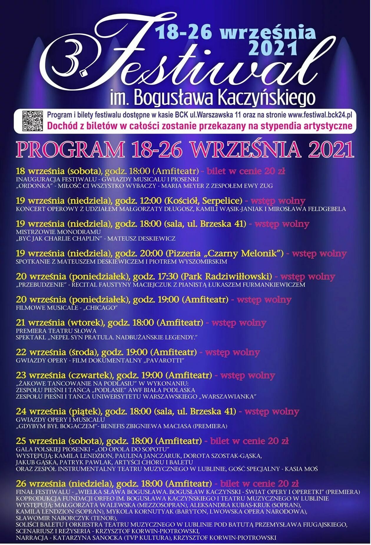 Chodzi o koncerty 18, 25 i 26 września. Bilety można kupić przez internet lub w kasie BCK. – Zrobiliśmy to dlatego, ponieważ po ubiegłorocznej edycji mieliśmy uwagi od osób spoza Białej, że nie mogły uczestniczyć w wydarzeniu. Tym razem chcemy im to umożliwić. Natomiast cały dochód ze sprzedaży biletów przeznaczamy na stypendia artystyczne dla bialskiej młodzieży – podkreśla prezydent Michał Litwiniuk. Jest to możliwe, dzięki wsparciu wielu sponsorów, którzy dołożyli środki do organizacji festiwalu.