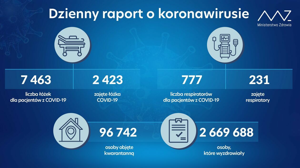 Do tej pory w Polsce odnotowano 2 923 304 przypadków zakażenia koronawirusem. Zmarło 75 869 chorych, a wyzdrowiało 2 669 688 pacjentów.