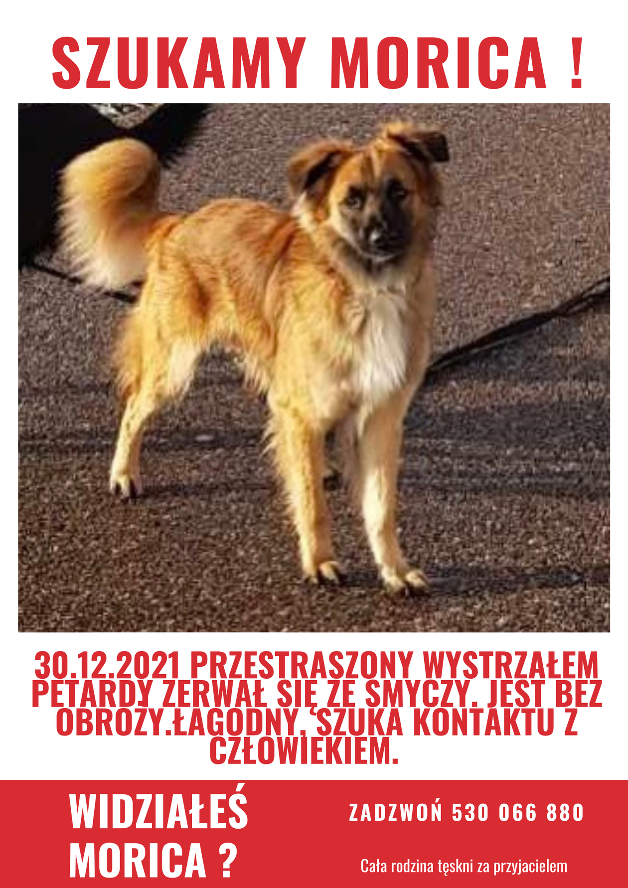 – Gdzie jest Moric? – to pytanie Aleksandra Węgorek zadaje sobie od czwartku. 30 grudnia wieczorem rudy mieszaniec zerwał się ze smyczy i przestraszony wystrzałami w panice rzucił się przed siebie.