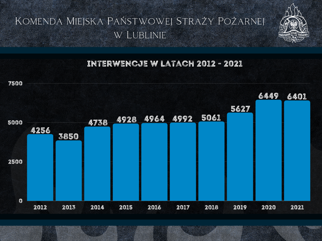 – W 2021 roku Komenda Miejska Państwowej Straży Pożarnej w Lublinie odnotowała 6401 zdarzeń. Doszło do 1148 pożarów, 4627 miejscowych zagrożeń oraz 626 alarmów fałszywych. W stosunku do poprzedniego roku zanotowano niewielki spadek liczby interwencji (6449 zdarzeń w 2020 roku). Na terenie Lublina doszło do 4176 zdarzeń, a na terenie powiatu lubelskiego interweniowaliśmy 2225 razy – tak zaczyna swój raport straż pożarna, a autorami opracowania jest st. kpt. Andrzej Szacoń i asp. Bartłomiej Pytka.