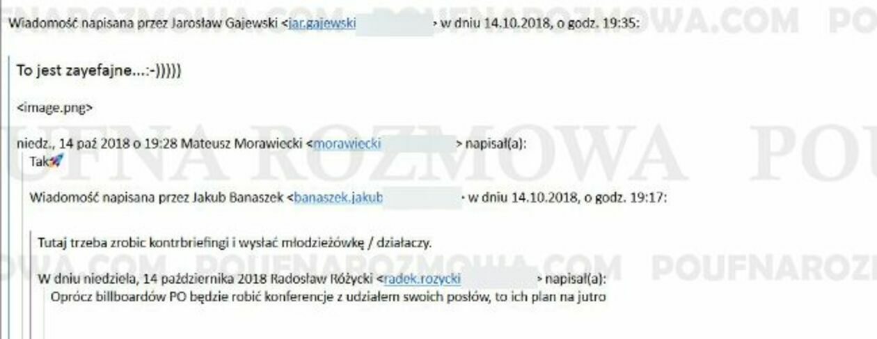 Komplet wiadomości pochodzi z października 2018 roku. Akurat trwała kampania wyborcza. Platforma Obywatelska ostro atakowała PiS i przez Polskę jechał „konwój wstydu”. Były to lawety samochodowe z wizerunkami np. Mateusza Morawieckiego i Jarosława Kaczyńskiego, punktujące ich słowa i poczynania. Na każdym przystanku konwoju organizowano także konferencje prasowe. Z maili wynika, że premier i PiS szykowali odpowiedź. Były pomysły, aby zorganizować konwój wstydu Platformy, a uczestnicy dyskusji szukali odpowiednich tematów do poruszenia. Chciano przypomnieć podwyższenie wieku emerytalnego, aferę hazardową, krytykę świadczenia 500 plus.