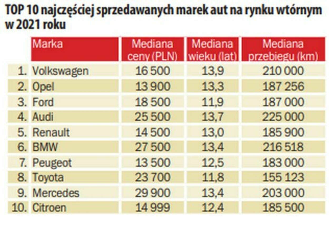 Według miesięcznego raportu AAA AUTO opartego na analizie danych dotyczących sprzedaży aut używanych w komisach, na stronach internetowych oraz u dealerów samochodów używanych, w styczniu 2022 roku w Polsce pojawiło się 194.848 ofert sprzedaży samochodów używanych, co oznacza wzrost w stosunku do grudnia 2021 roku o 12.661 aut. Natomiast mediana ceny aut używanych wyniosła 22.500 zł, a więc spadła o 1.400 zł w stosunku do grudnia 2021 roku. Jest to pierwszy spadek mediany ceny od pięciu miesięcy, czyli od sierpnia 2021 roku, gdy mediana ceny wynosiła 20.000 zł.