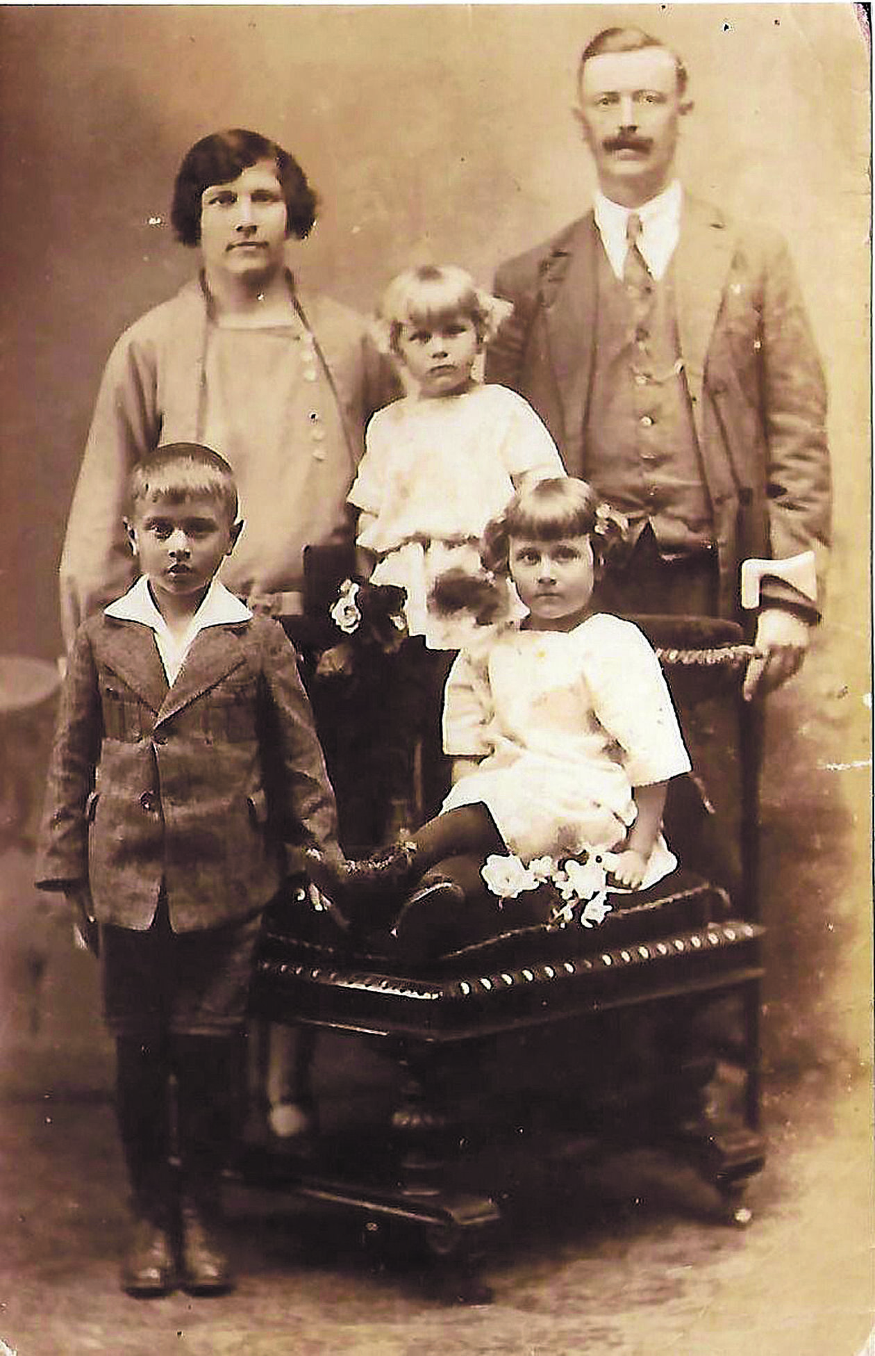 Autor wierszowanych życzeń wymienia Janka, Delcię (Adelę) i Maniusię. To mama pani Brigitte. Na rodzinnej fotografii najmłodsza dziewczynka o jasnych włosach stojąca między rodzicami.