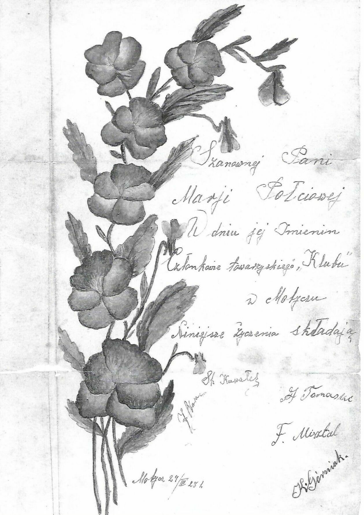 Pięć osób, które się podpisały na życzeniach, były członkami jakiegoś „Klubu”, do którego zapewne należeli też dziadkowie pani Brigitte. Z lektury życzeń wynika, że mogli tak nazywać grupę swoich przyjaciół czy dobrych znajomych. Imieniny pani Połciowej były okazją do spotkania „Klubu”.