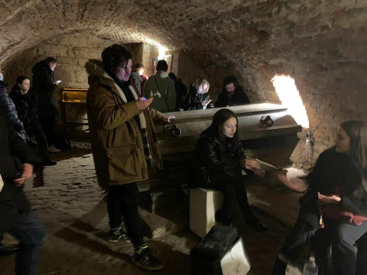 Jeden ze schronów we Lwowie jest w muzeum pod jednym z kościołów. Ludzie czekają na koniec syren alarmowych i przy okazji mogą dotknąć historii.