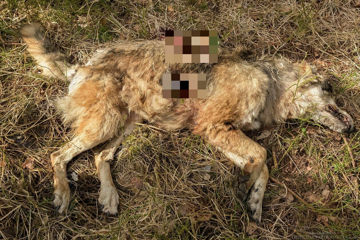 Wilk zginął około 2 tygodnie wcześniej, bo ciało nosiło ślady częściowego rozkładu. Ale wciąż był dobrze widoczny ślad po pocisku. Dlatego przyrodnik wezwał na miejsce policję z Wisznic i członków stowarzyszenia „Z Szarym za Płotem”. Policyjny technik dokonał oględzin miejsca, ale – jak ustaliliśmy – pocisku nie odnaleziono.