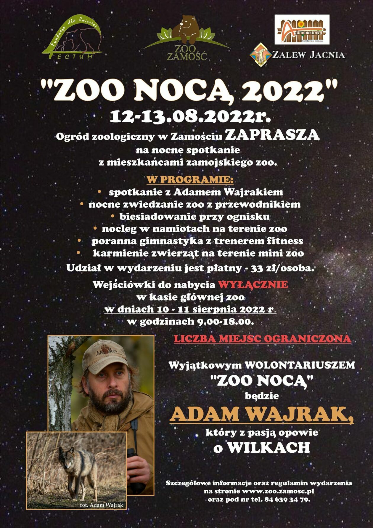 Jak to wszystko ma wyglądać? Od godz. 17 zaplanowano wejścia gości. Później będzie czas na rozbicie namiotu (trzeba mieć własny) we wskazanym miejscu. O godz. 19 rozpocząć się ma spotkanie z dziennikarzem i przyrodnikiem Adamem Wajrakiem, który opowie o wilkach. Później planowany jest nocny spacer po ZOO z przewodnikiem, później biesiada przy ognisku (prowiant należy zorganizować we własnym zakresie), noc pod namiotami, a rano gimnastyka z trenerem fitness oraz możliwość karmienia zwierzaków w mini-zoo.