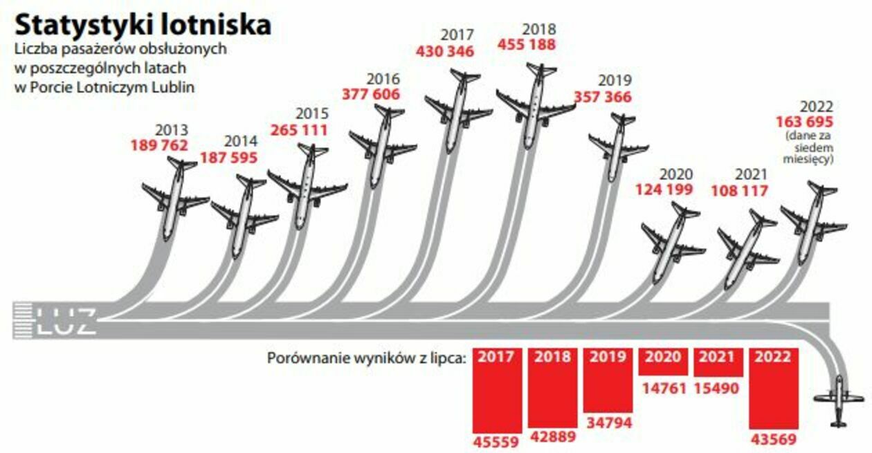 Lubelskie lotnisko w 2020 roku odprawiło 124 tys. podróżnych przy 357 tys. rok wcześniej i 455 tys. w rekordowym roku 2018. Wynik „podciągnęły” nieco styczeń i luty, kiedy nie obowiązywały jeszcze pandemiczne obostrzenia. Rok 2021 był jeszcze gorszy, bo odprawiono zaledwie 108 tys. pasażerów – najmniej w niespełna dziesięcioletniej historii portu.