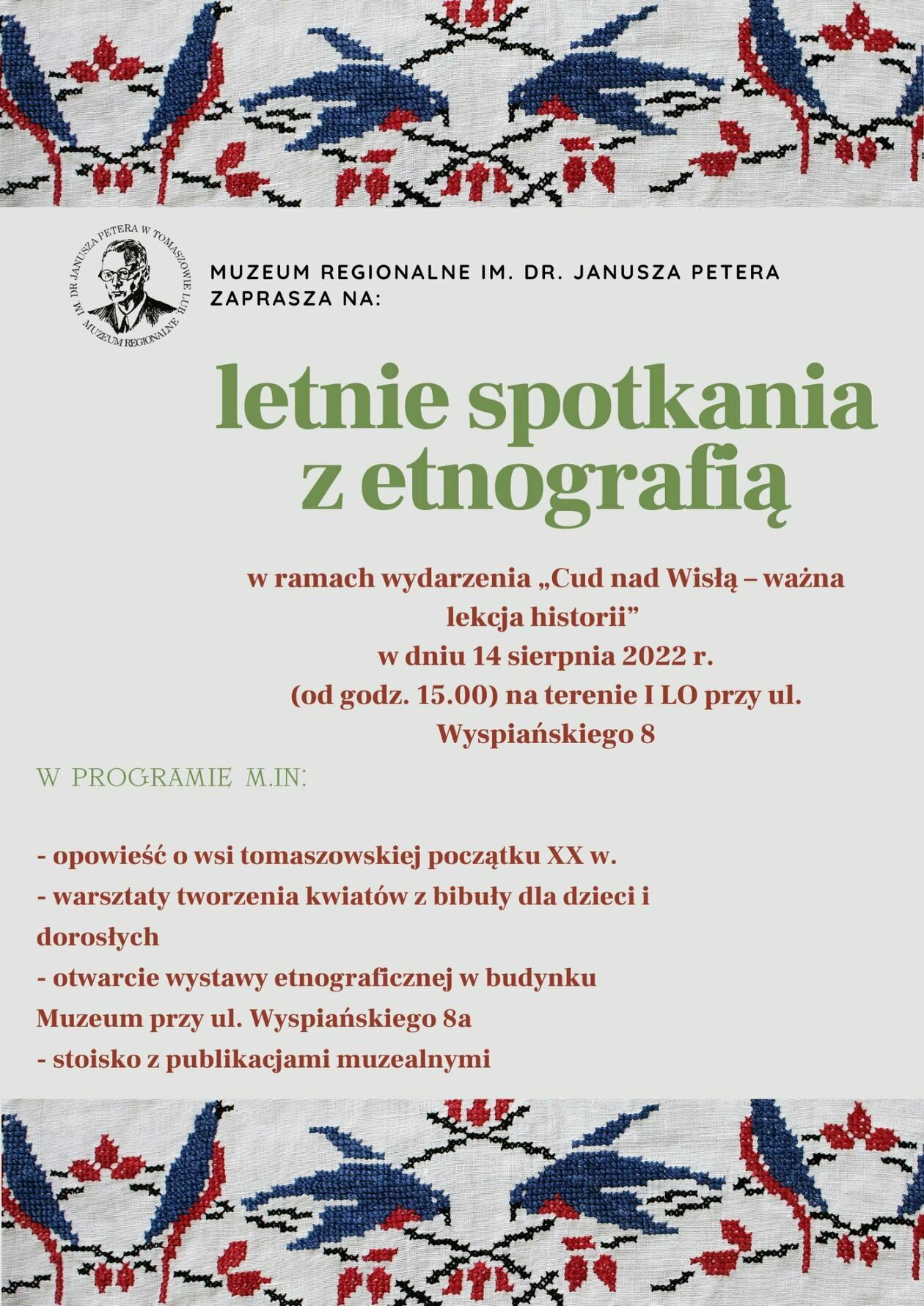 Na ten sam dzień, w ramach wydarzenia "Cud nad Wisłą. Ważna lekcja historii" (godz. 15) odbędą się także na Wyszyńskiego 8 "Letnie spotkania z etnografią". W programie m.in. opowieści o wsi tomaszowskiej początku XX wieku, warsztaty tworzenia kwiatów z bibuły, a w muzeum otwarcie etnograficznej wystawy.