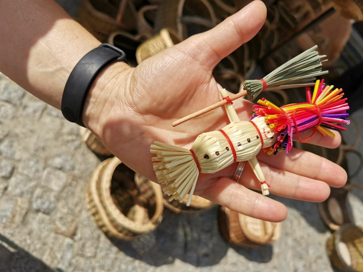 – Nie mogłam się oprzeć, śliczne są, prawda? I tylko 10 złotych – Anna Koblak wyciąga na dłoni słomiane bałwanki na choinkę. – Mają tak prostą formę, że dzieci będą mogły zrobić – dodaje. Przyjechała z krakowskiego, na jarmarku bywa często, sama robi lalki motanki i wycinanki z papieru. Oglądała małe torebki-koszyki na stoisku Violety Vitkauskaite, bo kilka lat temu kupiła wiklinowy plecak, który bardzo chwali. I nadal takie plecaki są w asortymencie. Ceny 150-170 złotych. Koszyki 80-120. Te, które maja kabłąki z kawałka drewna i wyszukana formę – droższe. – Oni używają cieńszych gałązek, splot jest drobniejszy. No i wiklina nie jest brązowa czy ruda jak nasza.