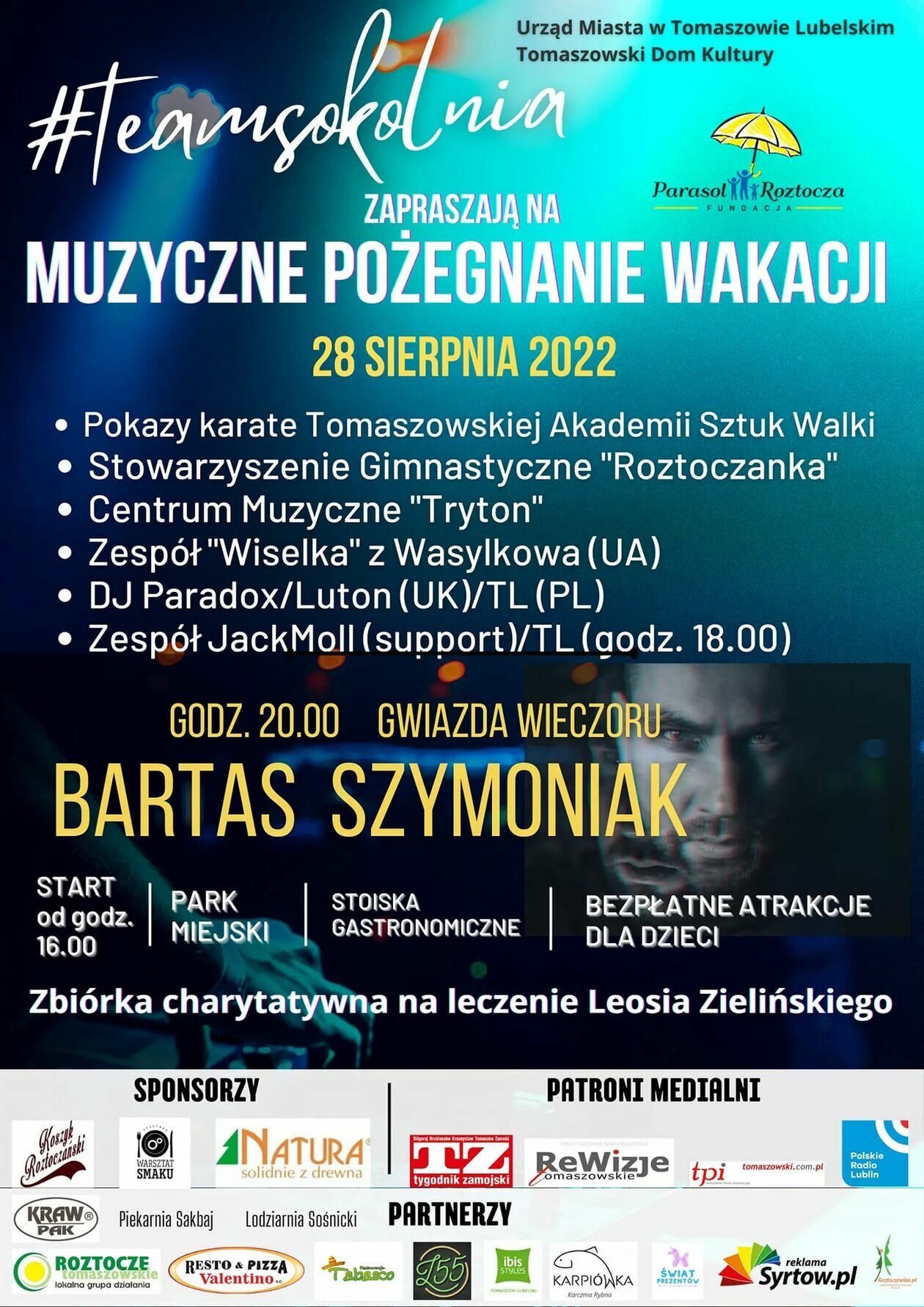 Na godz. 16 zaplanowano koncert miejscowego zespołu JackMoll, który wystąpi jako support gwiazdy wieczoru czyli Bartasa Szymoniaka. Ten wyjdzie na scenę o godz. 20. To kompozytor, autor tekstów, twórca własnego stylu beatrock, który w latach 2008-2015 był wokalistą grupy Sztywny Pal Azji.