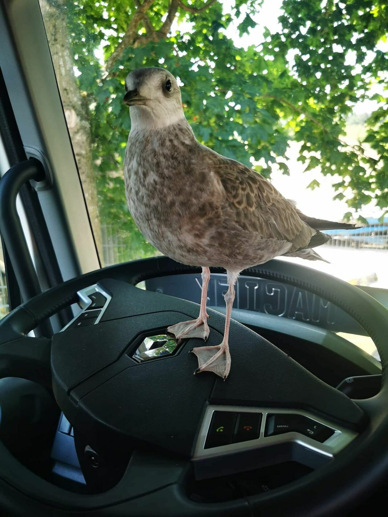 Traf chciał, że akcja ratunkowa była niespodziewanie długa i zostały po niej świetne zdjęcia. Jak tu się nie zainteresować widokiem młodej mewy siedzącej na kierownicy ciężarówki.