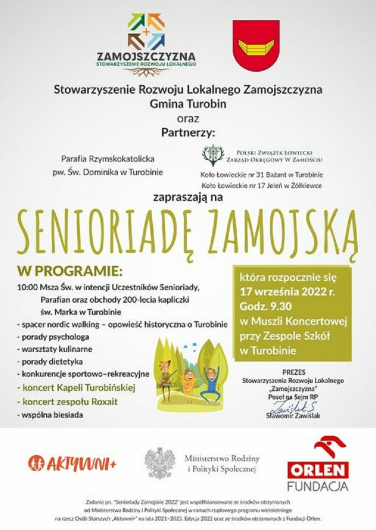 Senioriada Zamojska jest współfinansowana ze środków Ministerstwa Rodziny i Polityki Społecznej w ramach rządowego programu wieloletniego na rzecz Osób Starszych „Aktywni+” przy wsparciu Fundacji Orlen.