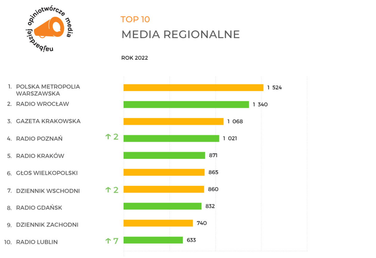 Pierwsze miejsca należą do: Polskiej Metropolii Warszawskiej, Radia Wrocław i Gazety Krakowskiej. Dalej uplasowały się: Radio Poznań, Radio Kraków i Głos Wielkopolski. Niżej niż Dziennik Wschodni są jeszcze: Radio Gdańsk i Dziennik Zachodni.