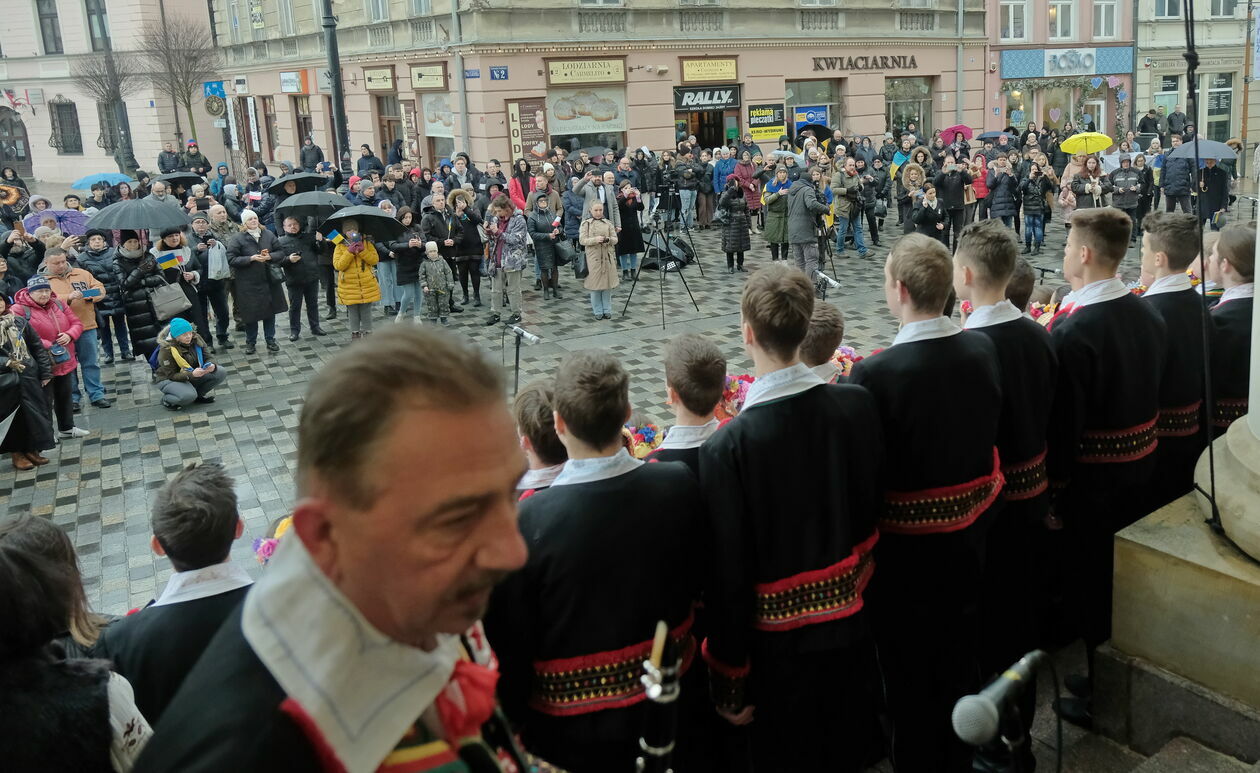To jedno z wydarzeń zorganizowanych w związku z 1. rocznicą ataku Rosji na Ukrainę. Na schodach ratusza ustawił się chór.