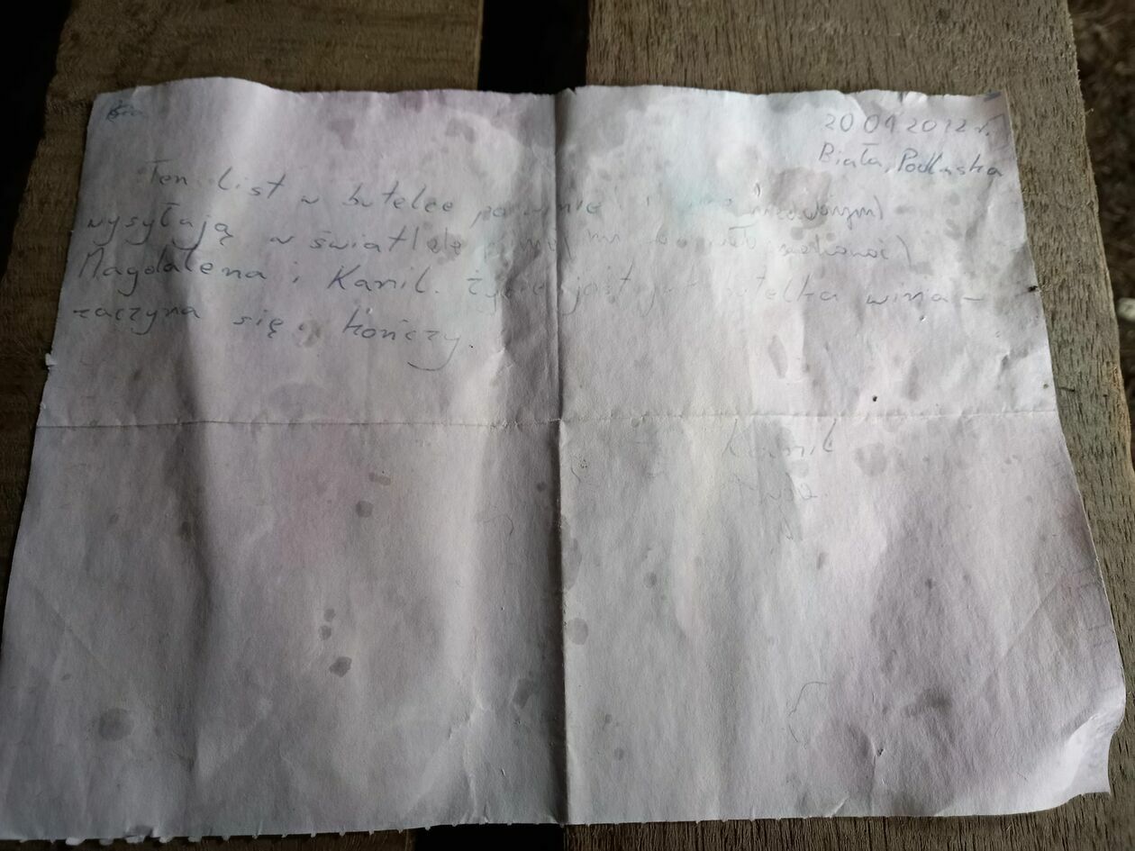 Trochę nieczytelny, ale z treści wynika, że napisali go Magdalena i Kamil z Białej Podlaskiej 20 kwietnia 2012 roku. ,,Ten list w butelce po winie (…) wysyłają w świat (…) Magdalena i Kamil. Życie jest jak butelka wina – zaczyna się i kończy” – to udało się odczytać panu Arkadiuszowi.