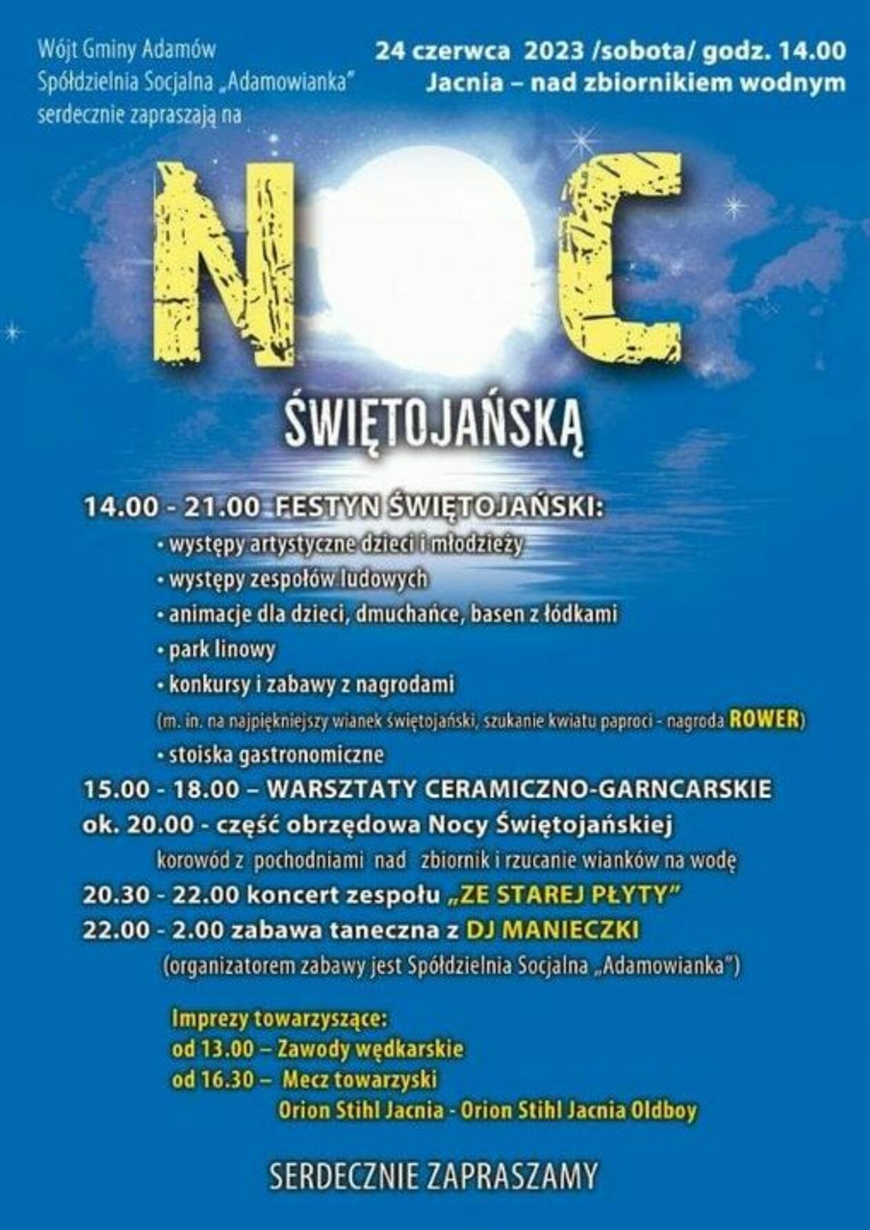 Zabawa nad zbiornikiem wodnym w Jacni zacznie się wczesnym popołudniem. Od godziny 14 aż do wieczora zaplanowano liczne występy, a także animacje dla najmłodszych. Czynny będzie park linowy i stoiska gastronomiczne. Poza tym zorganizowane zostaną zawody wędkarskie (godz. 13), a na pobliskim stadionie (godz. 16.30) zostanie rozegrany towarzyski mecz piłkarski.
