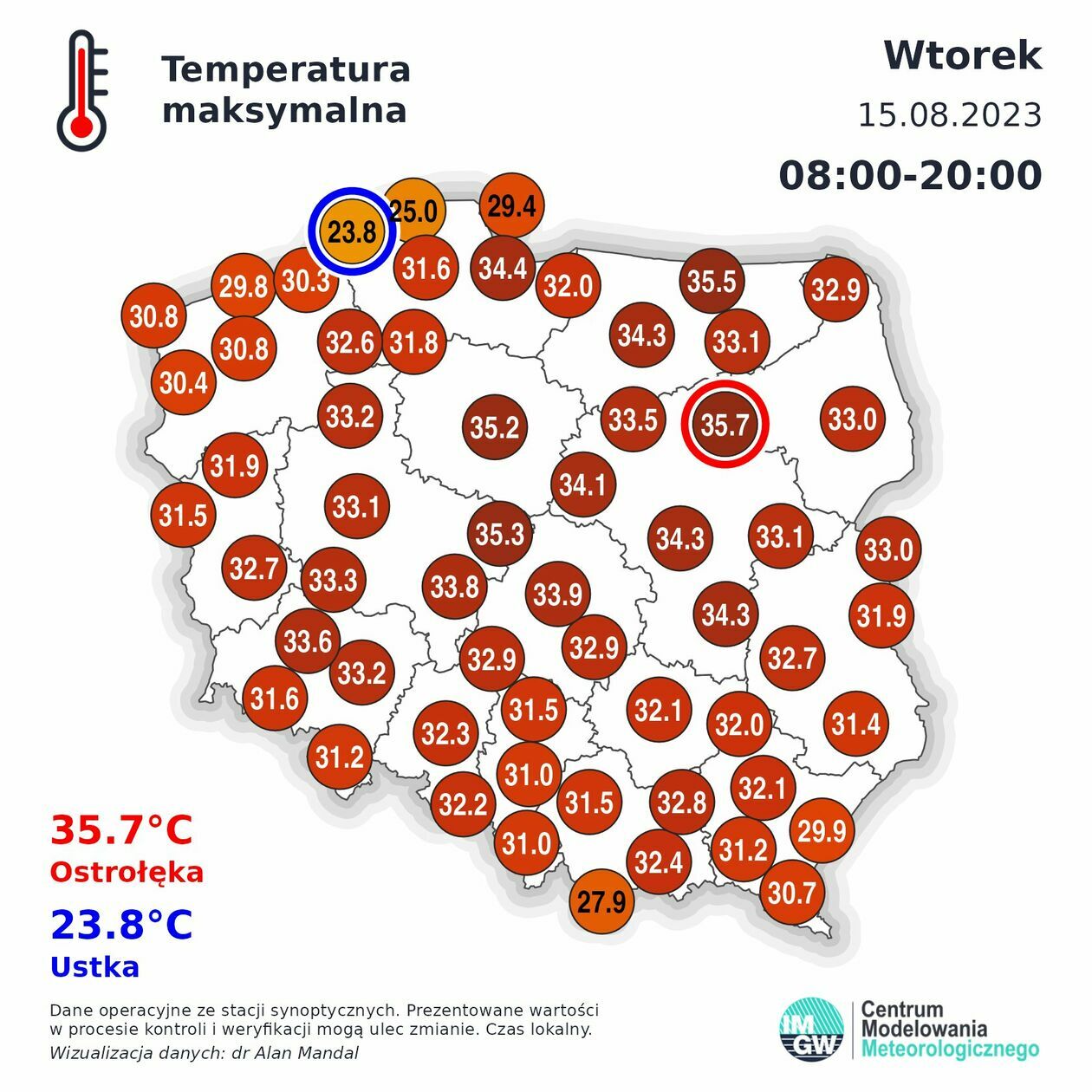 - Dziś najwyższa temperatura powietrza z pomiarów z czujników automatycznych wystąpiła w Legionowie i wyniosła 35,6°C. Jednak z podsumowania danych z termometrów maksymalnych na stacjach synoptycznych rekord dnia padł dzisiaj w Ostrołęce i wyniósł 35,7°C – poinformował IMiGW.