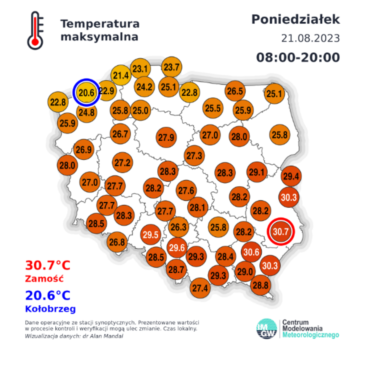 Tylko na południu i południowym-zachodzie spodziewane są przelotne opady deszczu, początkowo burze. Suma opadów w burzach może wynieść do 15 mm. Lokalnie mgły z widocznością do 300 m.