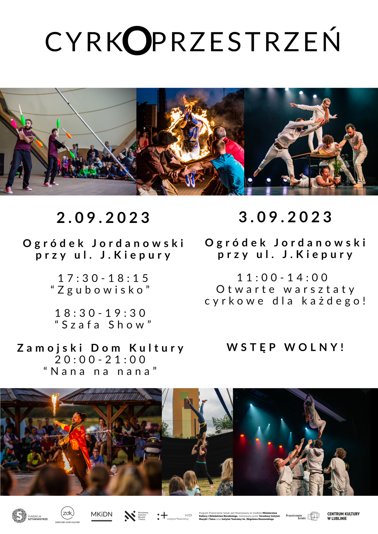 Do Zamościa przyjadą artystki i artyści z Fundacji Sztukmistrze. Pierwszego dnia pokażą „Zgubowisko” (godz. 17.30, Ogródek Jordanowski obok ZDK), familijny spektakl nowocyrkowy. Zaraz po tym, w tym samym miejscu zaplanowano (godz. 18.30) „Szafa Show”, czyli zakręcone pokazy ognia. O godz. 20, już w ZDK wystawiony zostanie spektakl „Nana na nana”. Na niedzielę planowane są natomiast otwarte warsztaty cyrkowe. Odbędą się znów w plenerze. Początek o godz. 11. Potrwają ok. 3 godzin.