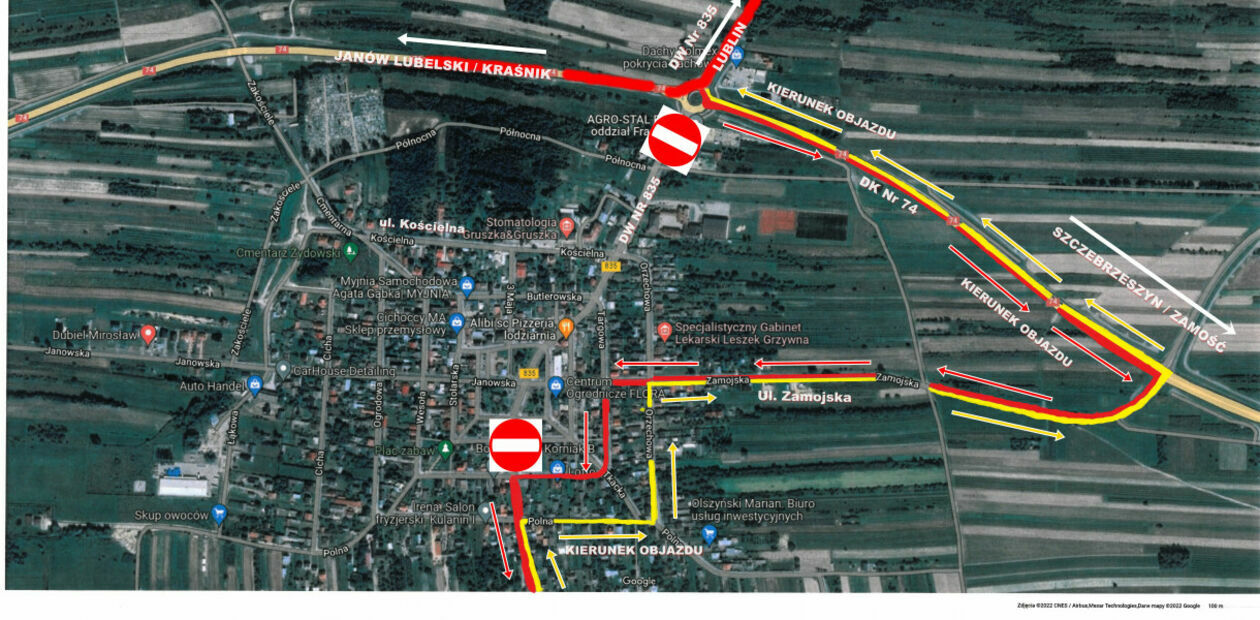 Od Biłgoraja ruch odbywać się będzie ulicą Przemysłową, Orzechową, Zamojską, DK nr 74 do ronda z DW Nr 835.