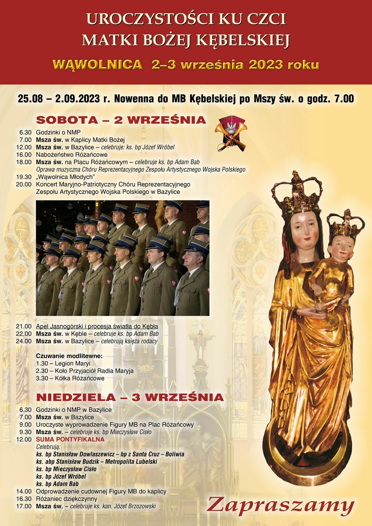 . Dwie godziny później w bazylice rozpocznie się koncert wojskowego zespołu artystycznego. O godz. 21 do Kębła ruszy tzw. procesja światła, którą zakończy nabożeństwo celebrowane przez ks. bpa Adama Baba.