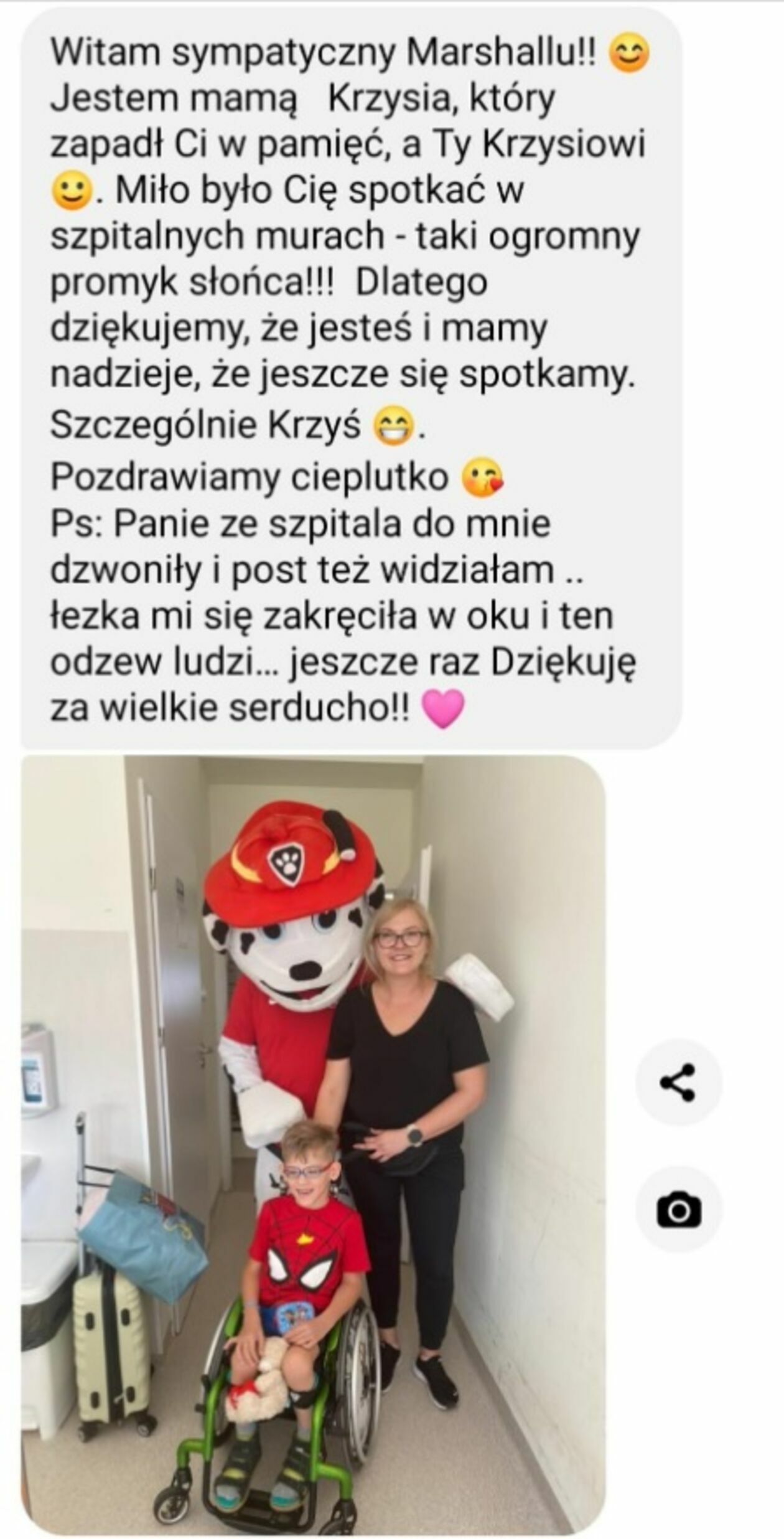 – Miło było Cię spotkać w szpitalnych murach – taki ogromny promyk słońca!!! Dlatego dziękujemy, że jesteś i mamy nadzieję, że jeszcze się spotkamy. Szczególnie Krzyś. Pozdrawiamy cieplutko. PS: Panie ze szpitala do mnie dzwoniły i post też widziałam… łezka mi się zakręciła w oku i ten odzdew ludzi… jeszcze raz Dziękuję za wielkie serducho!! – napisała dodając zdjęcie.
