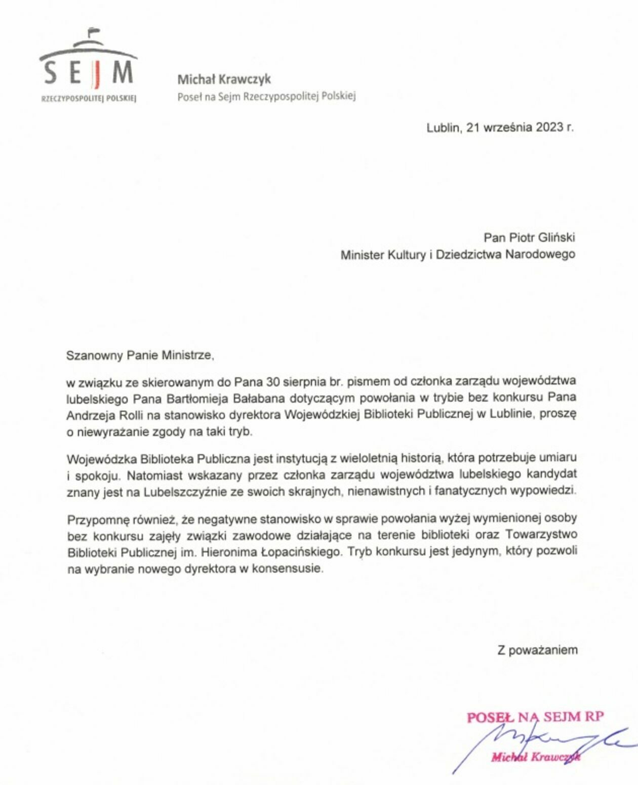 - Wojewódzka Biblioteka Publiczna jest instytucją z wieloletnią historią, która potrzebuje umiaru i spokoju. Natomiast wskazany przez członka Zarządu Województwa Lubelskiego kandydat znany jest na Lubelszczyźnie ze swoich skrajnych, nienawistnych i fanatycznych wypowiedzi. Przypomnę również, że negatywne stanowisko w sprawie powołania wyżej wymienionej osoby bez konkursu zajęły związki zawodowe działające na terenie biblioteki oraz Towarzystwo Biblioteki Publicznej im. Hieronima Łopacińskiego. Tryb konkursu jest jedynym, który pozwoli na wybranie nowego dyrektora w konsensusie - napisał w piśmie do ministra poseł Krawczyk.