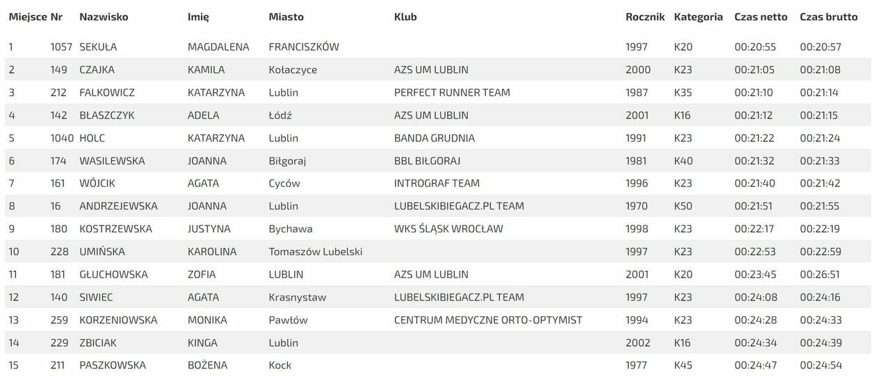 Wśród kobiet najszybsza była Magdalena Sekuła. Pokonała dystans w 20 minut i 55 sekund, o 10 sekund szybciej od Kamili Czajki i o 15 sekund od Katarzyny Falkowicz.