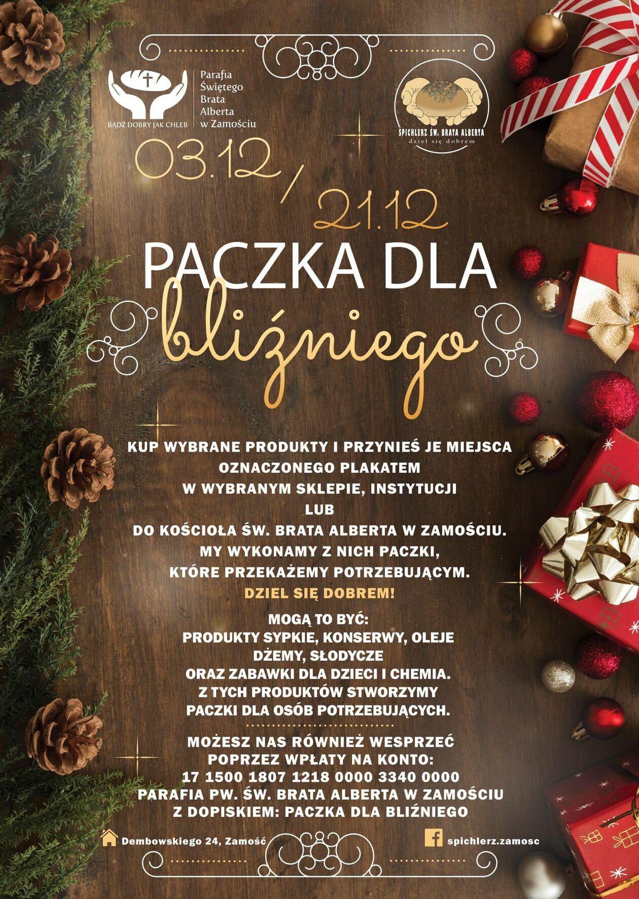 To wszystko można dostarczać od powiedziałku do piątku na ul. Dembowskiego 24 do kancelarii parafii pw. św. Brata Alberta (w godz. 8-9 i16-17) albo przynosić do kościoła w trakcie nabożeństw. A jeśli ktoś ma do Zamościa daleko, może dołączyć się do akcji dokonując wpłat na konto: 17 1500 1807 1218 0000 3340 0000 z dopiskiem „Paczka dla bliźniego”.