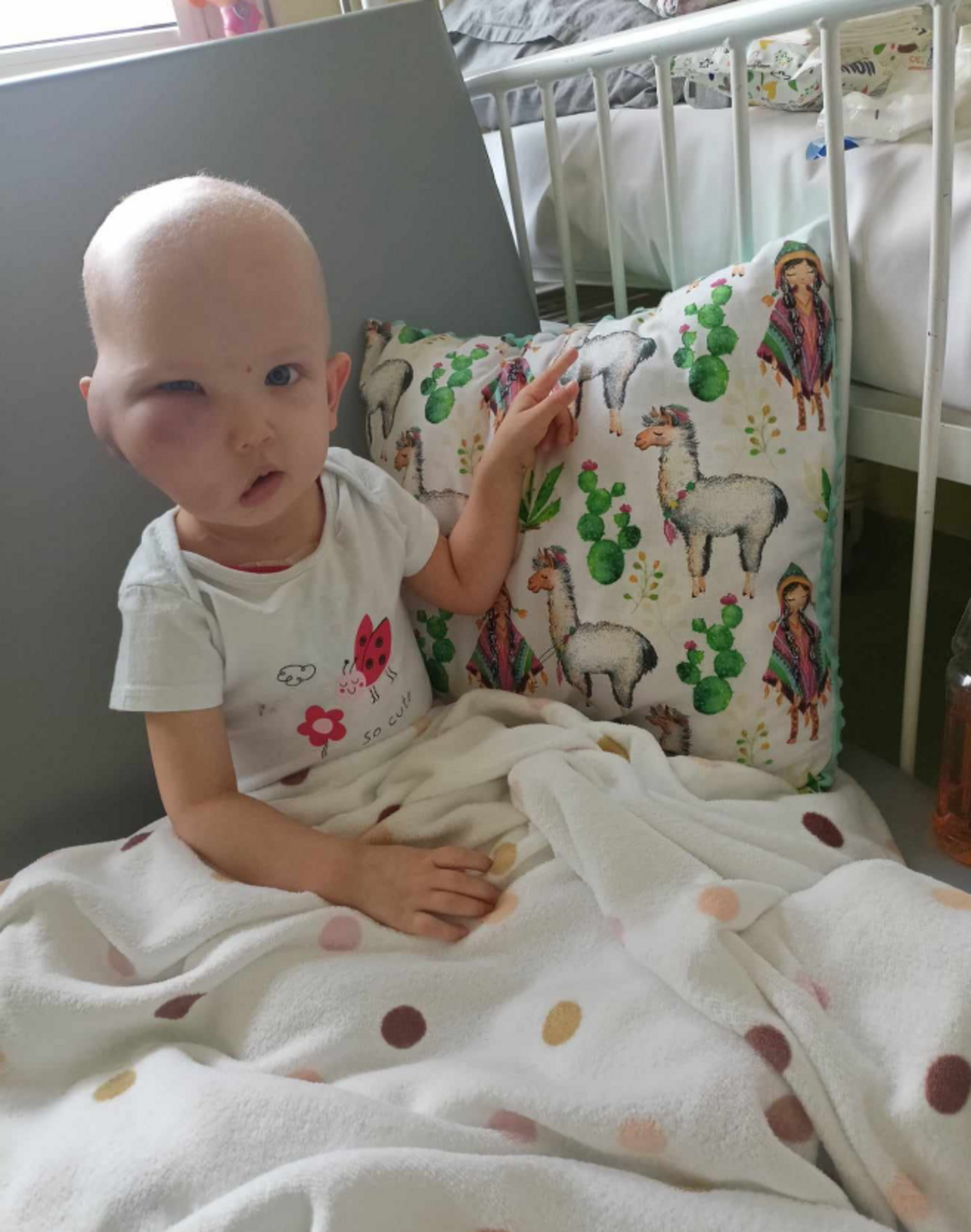 Kolejne badania. Zajęte węzły chłonne. Litry chemioterapii, ból, cierpienie. Do tej pory malutka przeszła już 9 bloków chemioterapii oraz operację usunięcia guza, która niestety nie przyniosła oczekiwanych efektów. Nowotworowa narośl znów rośnie. Wprowadzono II linię chemioterapii. Wykryto naciek raka na kość skroniową.