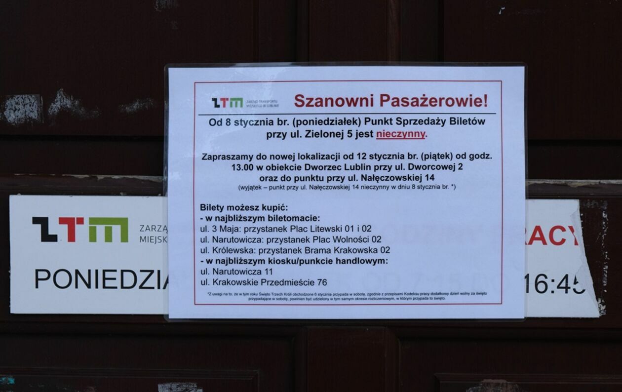 - Wiąże się to z tymczasową przerwą w dostępie tego punktu dla pasażerów. Nowy punkt przy ul. Dworcowej 2 będzie czynny od najbliższego piątku, 12 stycznia od godz. 13.00. Godziny pracy nie ulegają zmianie tj. 7.15-16.45. Ponadto punkt przy ul. Nałęczowskiej 14 pracuje bez zmian – informuje ZTM.
