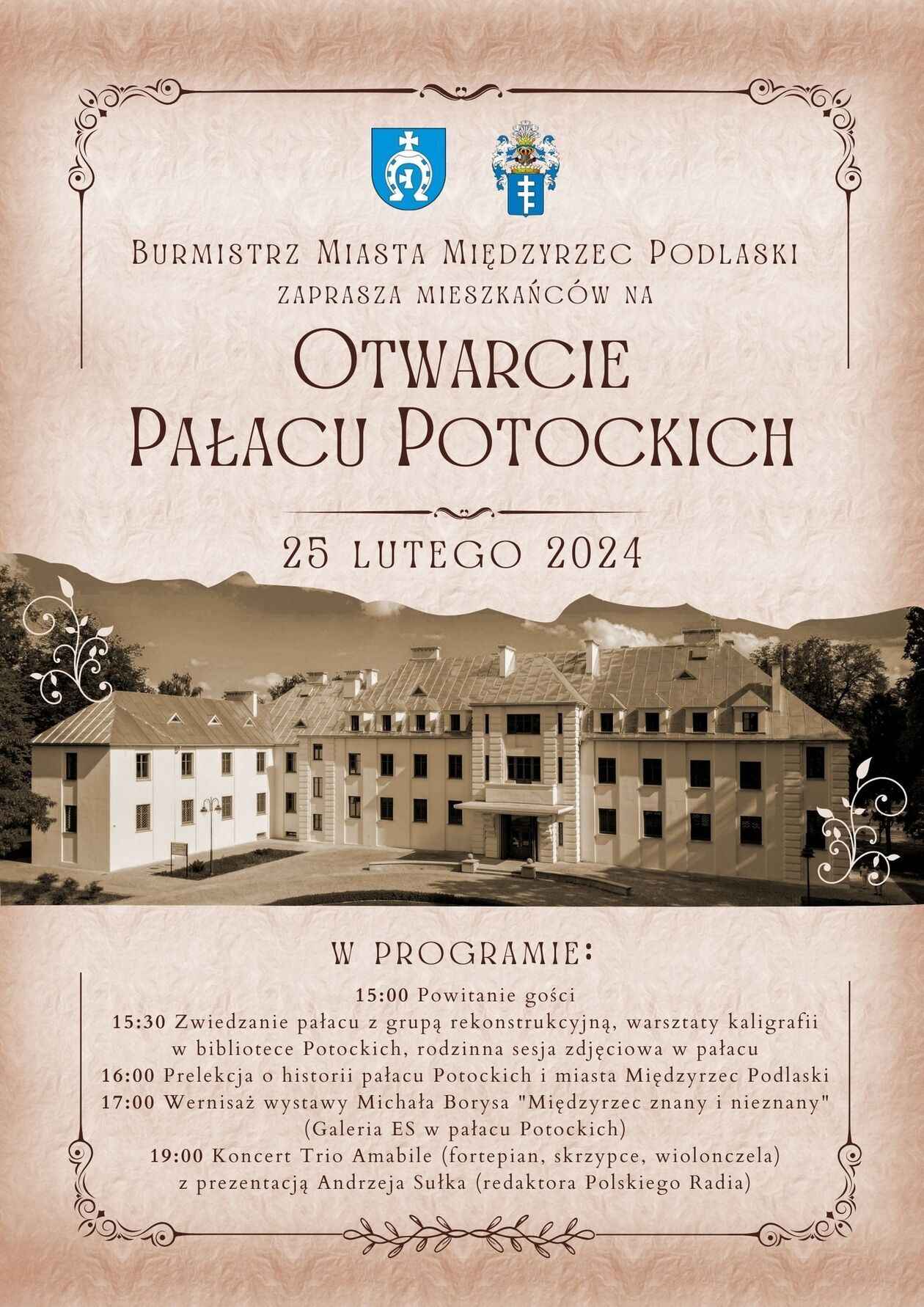 Podczas otwarcia atrakcji również nie zabraknie. O godz. 15.30 będzie można zwiedzić pałac z grupą rekonstrukcyjną. W planie również warsztaty kaligrafii i rodzinna sesja zdjęciowa. Później, odbędzie się prelekcja o historii rezydencji Potockich oraz miasta. Z kolei, o godz. 17 w pałacowej galerii Es rozpocznie się wernisaż wystawy Michała Borysa „Międzyrzec znany i nieznany”. Na koniec zaś koncert Trio Amabile (fortepian, skrzypce, wiolonczela).
