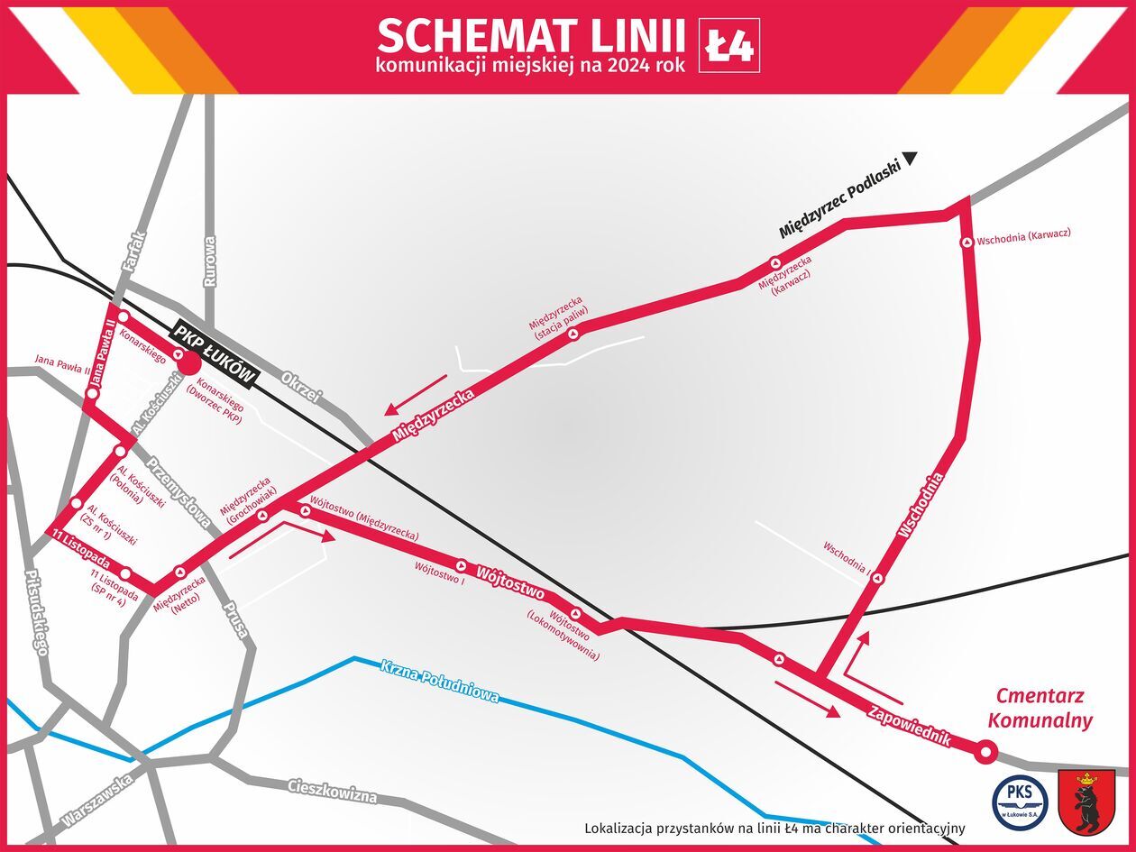 Od 2 kwietnia w trasę wyrusza nowa linia Ł4. - Tym razem autobusy PKS Łuków będą kursowały po północnej oraz wschodniej części naszego miasta. Swoim zasięgiem obejmą m.in. ul. Wójtostwo, Zapowiednik, czy Międzyrzecką- mówi Tomasz Goławski, kierownik referatu promocji w ratuszu. Jeden z przystanków znajdzie się przy cmentarzu komunalnym.