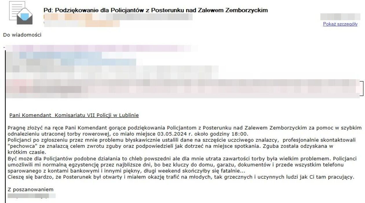 "Być może dla policjantów podobne działania to chleb powszedni, ale dla mnie utrata torby z zawartością byłaby wielkim problemem" - ocenił wdzieczny obywatel.