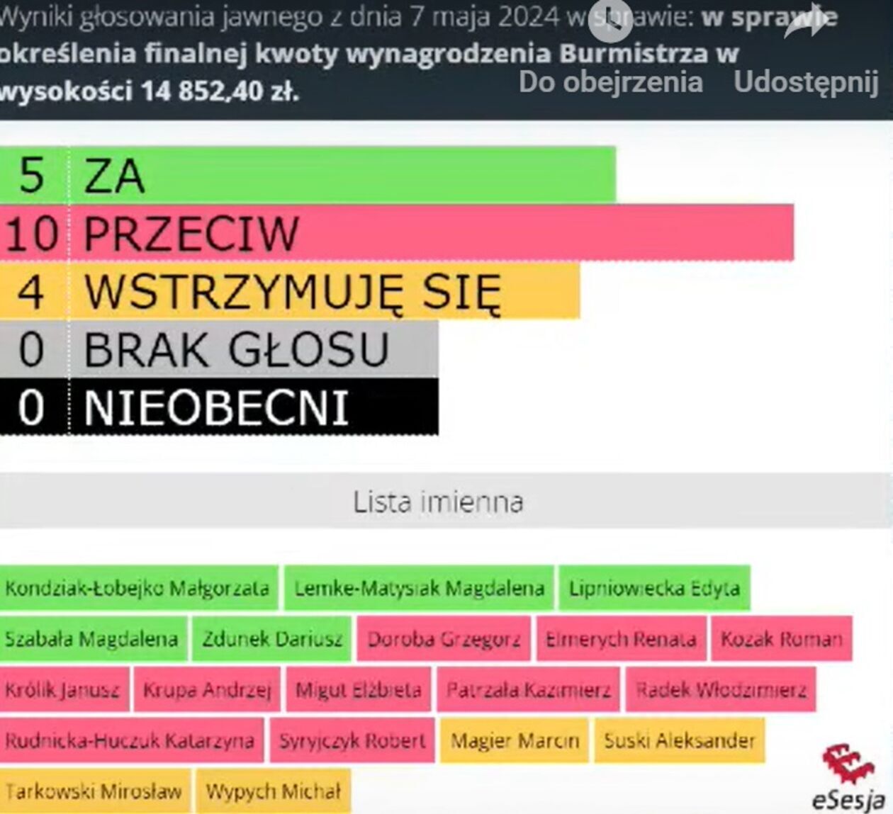 Wniosek Lipniowieckiej przepadł w głosowaniu. Z 19 radnych poparło go zaledwie pięcioro, oprócz wnioskodawczyni także Magdalena Szabała, Magdalena Lemke-Matysiak, Małgorzata Kondziak-Łobejko i Dariusz Zdunek. Czterech radnych: Aleksander Suski, Marcin Magier, Mirosław Tarkowski i Michał Wypych wstrzymało się od głosu. 10 radnych: 3 z PO i 7 z klubu burmistrza było przeciw.