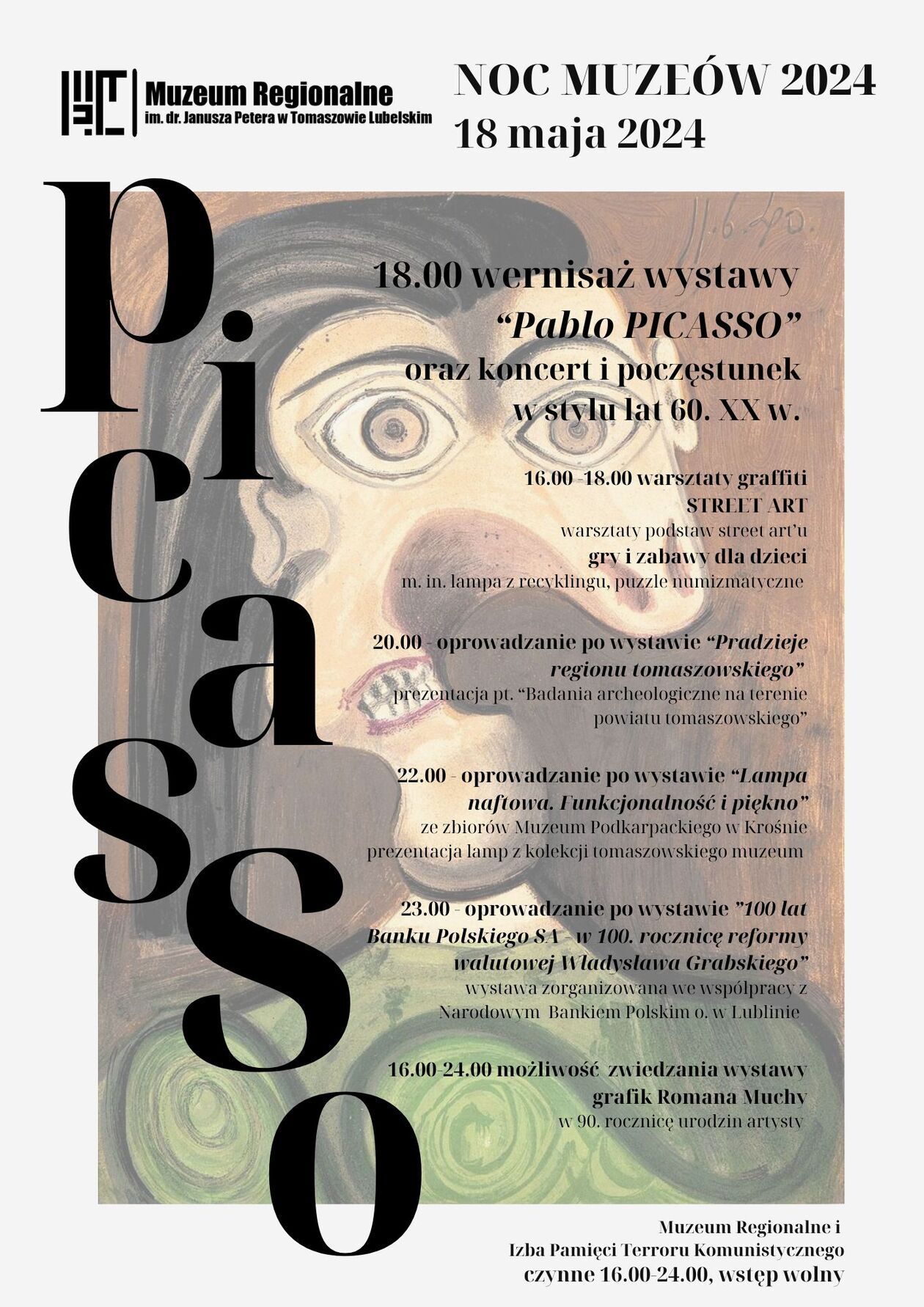 W ramach Nocy Muzeów dziać się jednak będzie więcej. Na godz. 16 planowane są warsztaty graffiti z grami i zabawami dla dzieci, na godz. 20 oprowadzanie po wystawie „Pradzieje regionu tomaszowskiego”, na godz. 22 po ekspozycji „Lampa naftowa. Funkcjonalność i piękno”, a na sam koniec (godz. 23) zaprezentowana ma być wystawa „100 lat Banku Polskiego S.A.”.