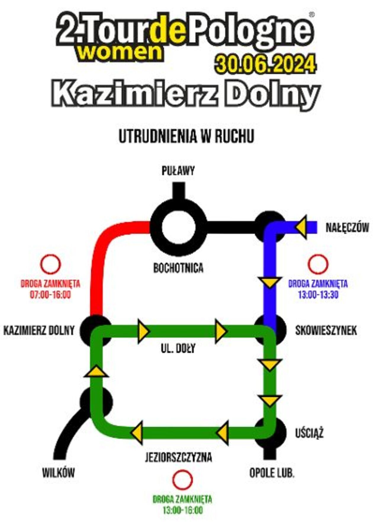 W trakcie imprezy kierowcy mogą spodziewać się utrudnień. W niedzielę, 30 czerwca, odcinek drogi łączącej Bochotnicę z Kazimierzem Dolnym (al. Kazimierza Dolnego, ul. Tyszkiewicza) w godz. 7-16 będzie wyłączony z ruchu. Korzystać z niego będą mogli jedynie mieszkańcy ww. ulic. Do miasta dostać się będzie można od strony Skowieszynka, ale tylko do godz. 13. W trakcie przejazdu peletonu zamknięte zostaną także wybrane odcinki pozostałych dróg, w tym wojewódzkich. Porządku pilnować będą wyznaczone służby, w tym policja oraz ochotnicze jednostki straży.