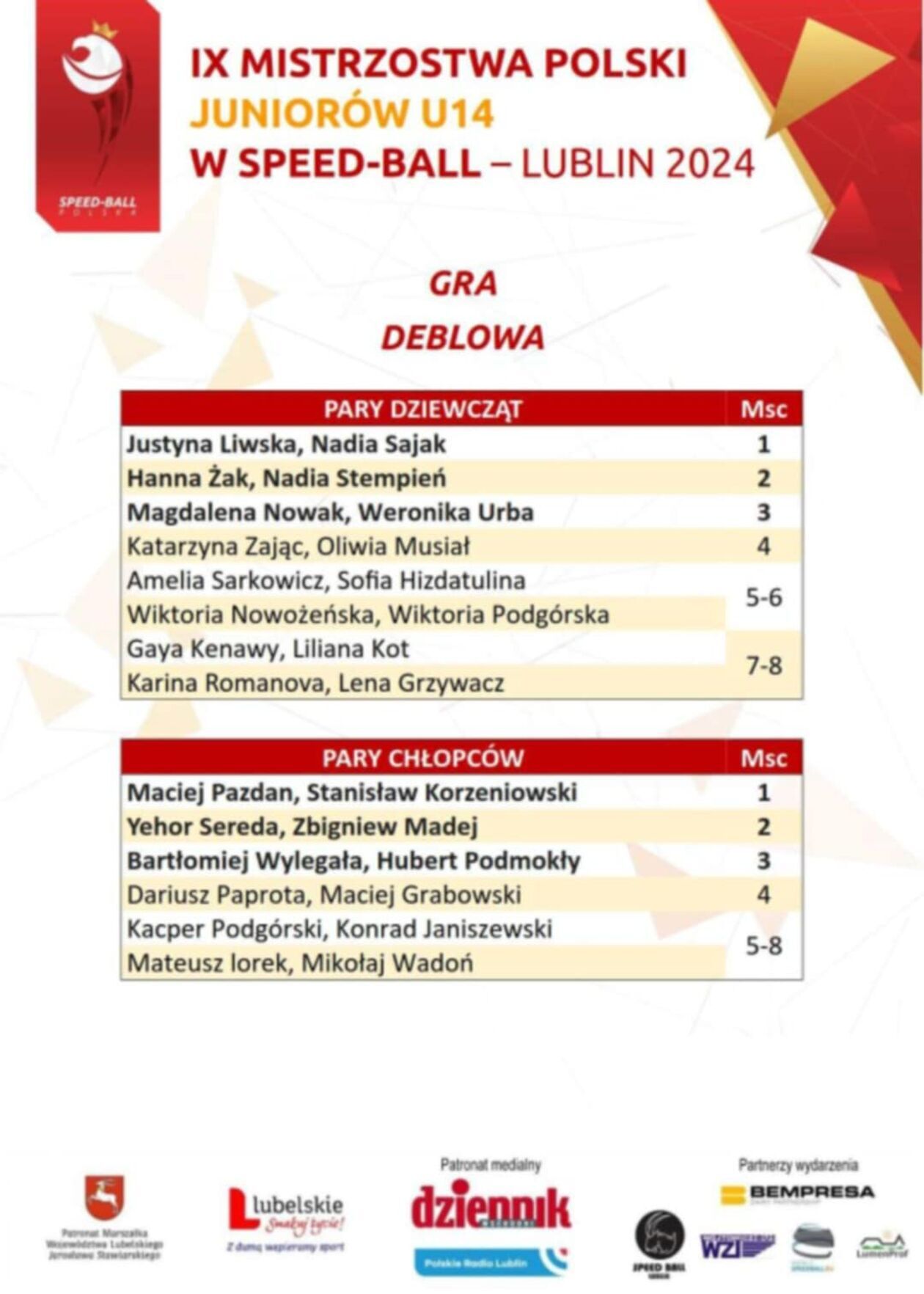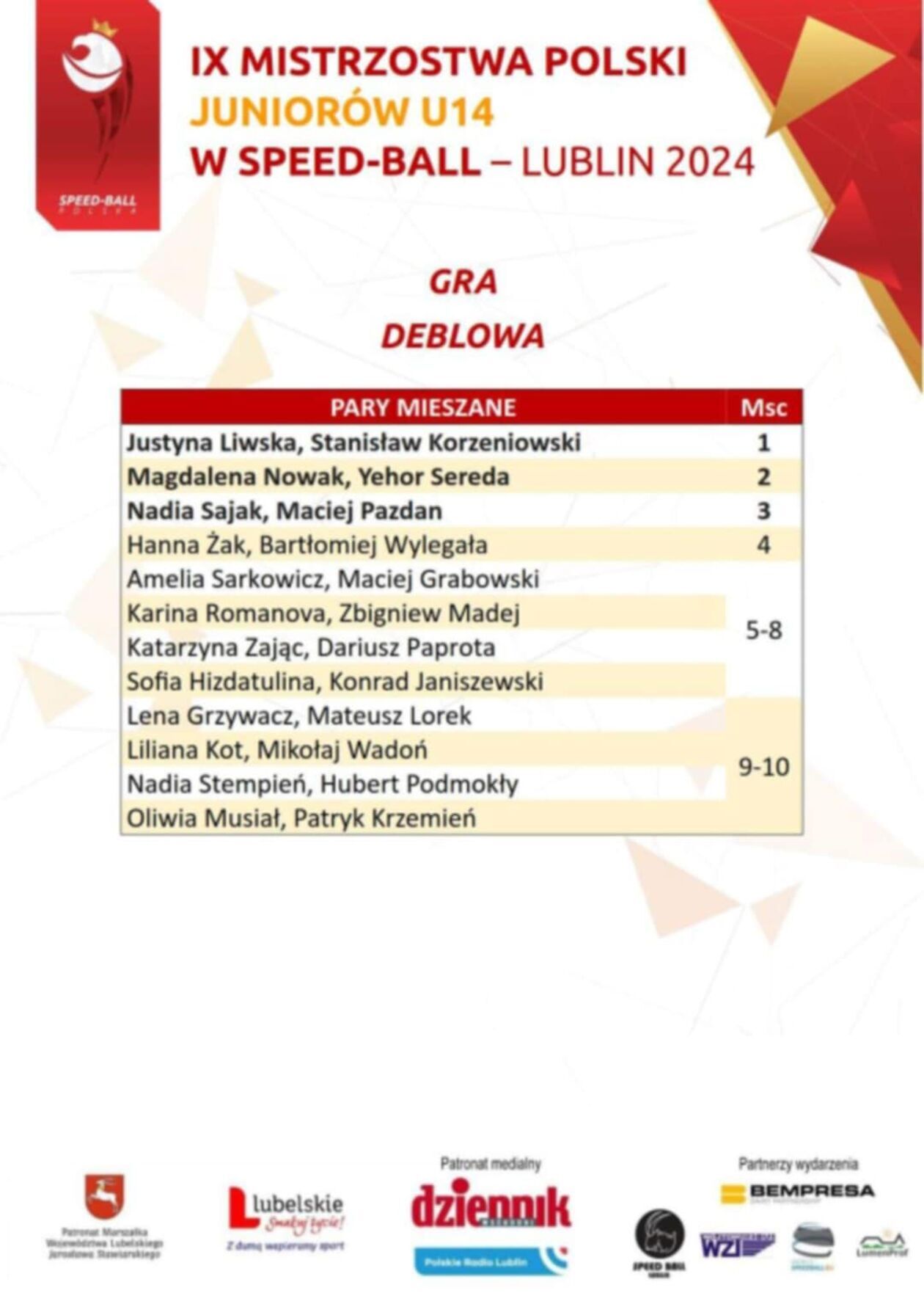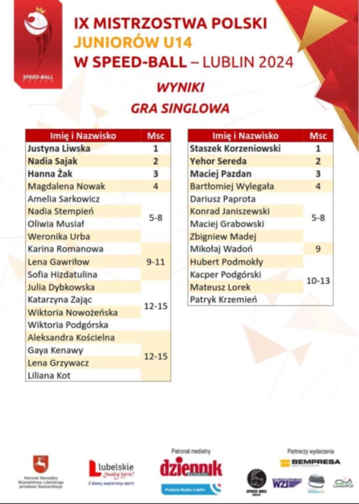 - IX Mistrzostwa Polski Juniorów U14 w Speed-Ballu pokazały, że poziom tej dynamicznej dyscypliny sportowej w Polsce stale rośnie. Młodzi zawodnicy wykazali się nie tylko wysoką sprawnością fizyczną, ale także wielką determinacją i wolą walki – cieszy się Mariusz Rzedzicki,nauczyciel wychowania fizycznego i animator znany z lubelskich Orlików od kilku lat namawia dzieci i młodzież do gry w speed-ball. - Szczególne gratulacje należą się Justynie Liwskiej i Stanisławowi Korzeniowskiemu, którzy zarówno w grze deblowej, jak i w konkurencjach indywidualnych, udowodnili swoją dominację w tej kategorii wiekowej – dodaje wielokrotny medalista mistrzostw świata.