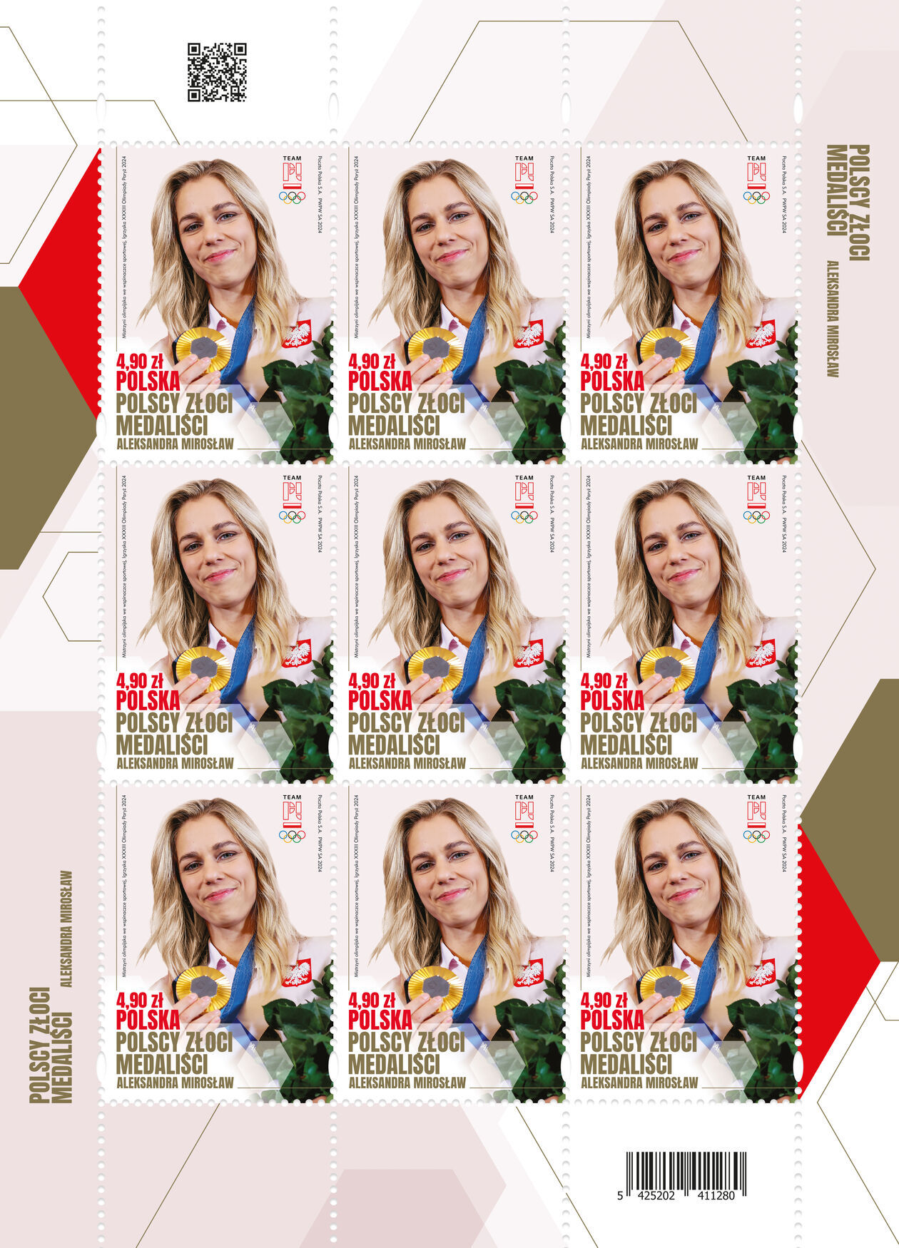 Ten sukces nie uszedł uwadze Poczcie Polskiej. Nasz narodowy dostawca korenspodencji w tym tygodniu wydał nowy znaczek, który zdobi portret Aleksandry Mirosław trzymającej swój złoty medal. W tle widać logo Team PL. Znaczek ma wymiary 31,25 na 43 mm, a wykonano go z papieru fluorescencyjnego. Wyszedł w nakładzie 126 tysięcy sztuk. Wartość każdej z nich to 4,9 zł. Do obiegu trafił w środę, 27 listopada. Kolekcję z rekordzistą świata uzupełnia koperta ozdobiona innym zdjęciem mistrzyni oraz okolicznościowy datownik.