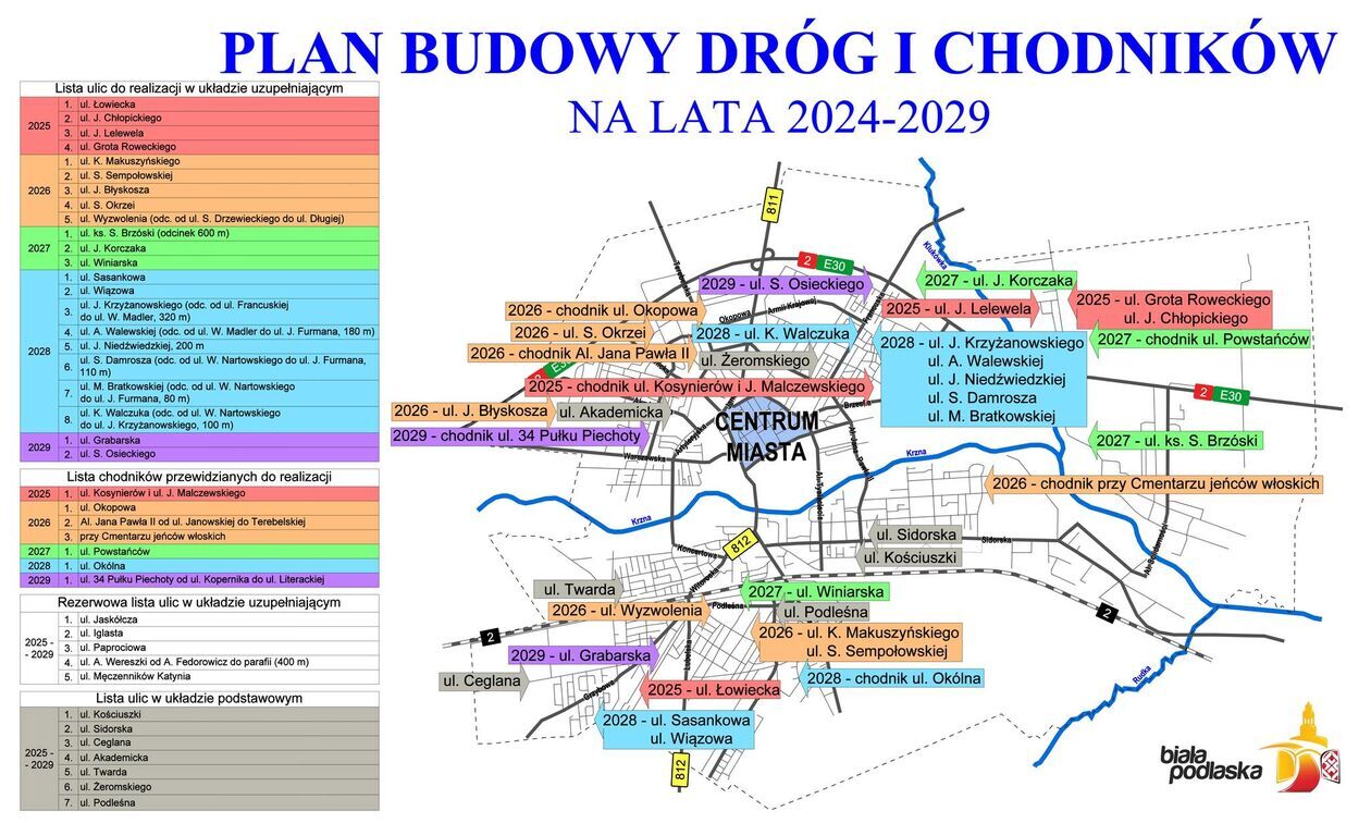 To druga taka koncepcja prezydenta Michała Litwiniuka (PO). W poprzedniej kadencji udało się zrealizować 28 inwestycji drogowych za ok. 90 mln zł. Z tego połowę, miasto pozyskało ze środków zewnętrznych. – Nadrabiamy wieloletnie zaniedbania w tym zakresie. W nowym planie uwzględniliśmy 29 dróg i fragmentów, w tym 22 to osiedlowe. Inwestycje wpisują się spójnie i proporcjonalnie we wszystkie kwartały miasta. Nie ma tu ulubionych dzielnic prezydenta czy radnych. Działamy ponad podziałami- przekonuje Litwiniuk. I na przykład w 2025 roku na liście znalazły się m.in. ulice: Łowiecka, Chłopickiego, Lelewela czy Grota Roweckiego. Powstaną też chodniki przy ulicach Malczewskiego i Kosynierów.