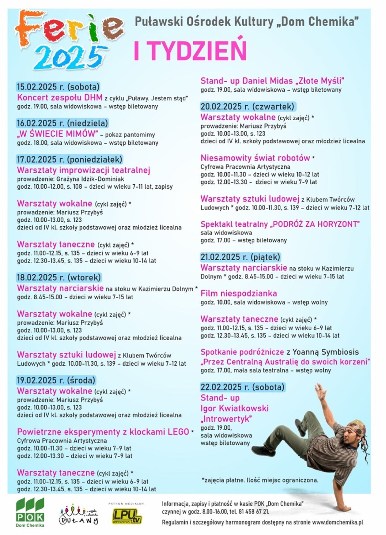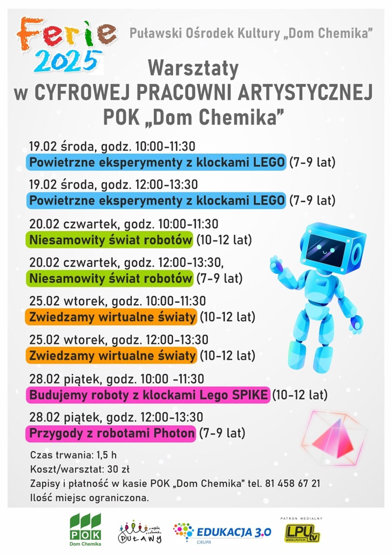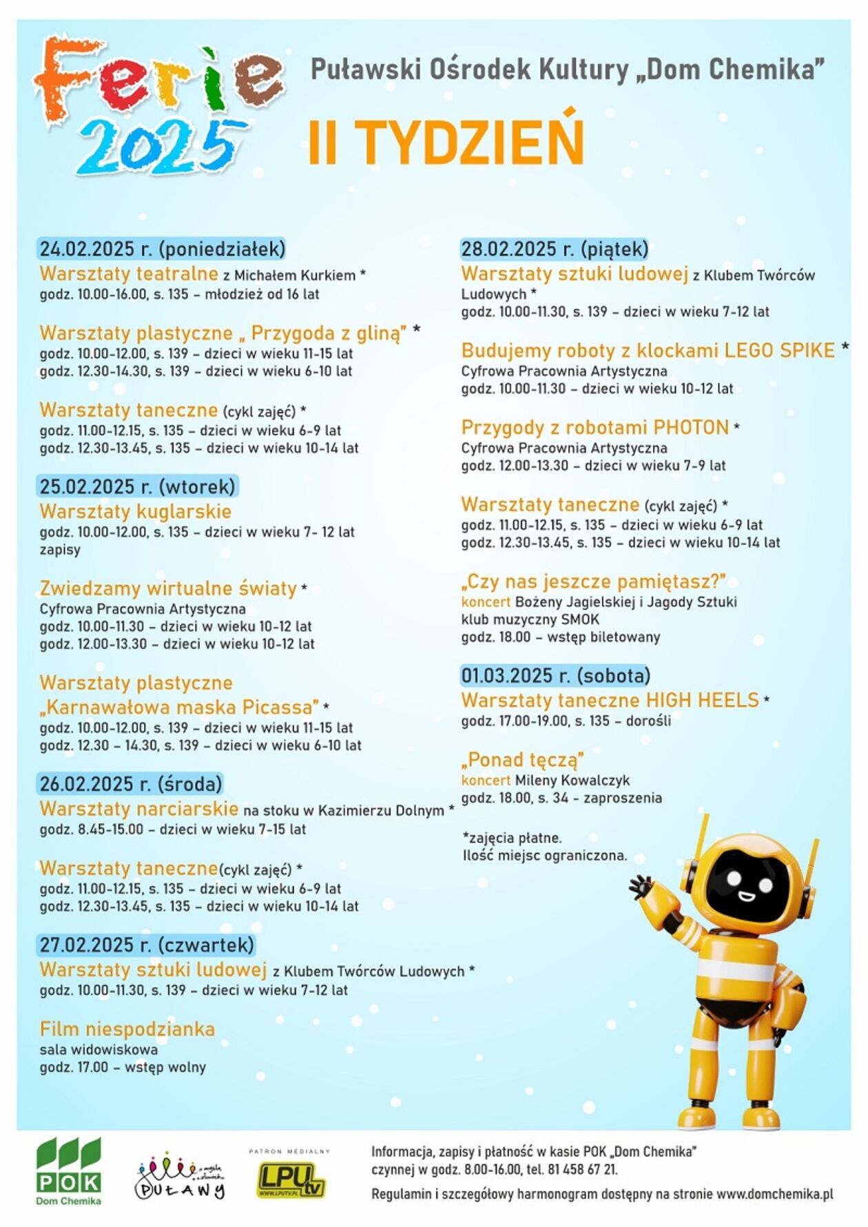 Dla tych, którzy wolą aktywność i ruch, Dom Chemika oferuje warsztaty narciarskie na malowniczym stoku w Kazimierzu Dolnym oraz zajęcia kuglarskie. Z kolei Cyfrowa Pracownia Artystyczna zaprasza na spotkanie ze światem robotów, eksperymenty z klockami lego oraz odkrywanie wirtualnej rzeczywistości.