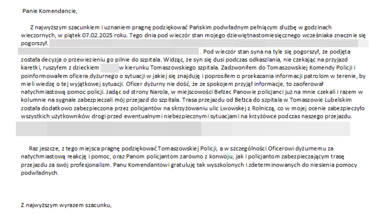 Dyżurny skierował do miejscowości Bełżec policjantów z Posterunku Policji w Lubyczy Królewskiej, którzy przy użyciu sygnałów uprzywilejowania pilotowali ojca do szpitala. Dzięki ich szybkiej reakcji dziecko bezpiecznie i na czas trafiło pod opiekę lekarzy.
