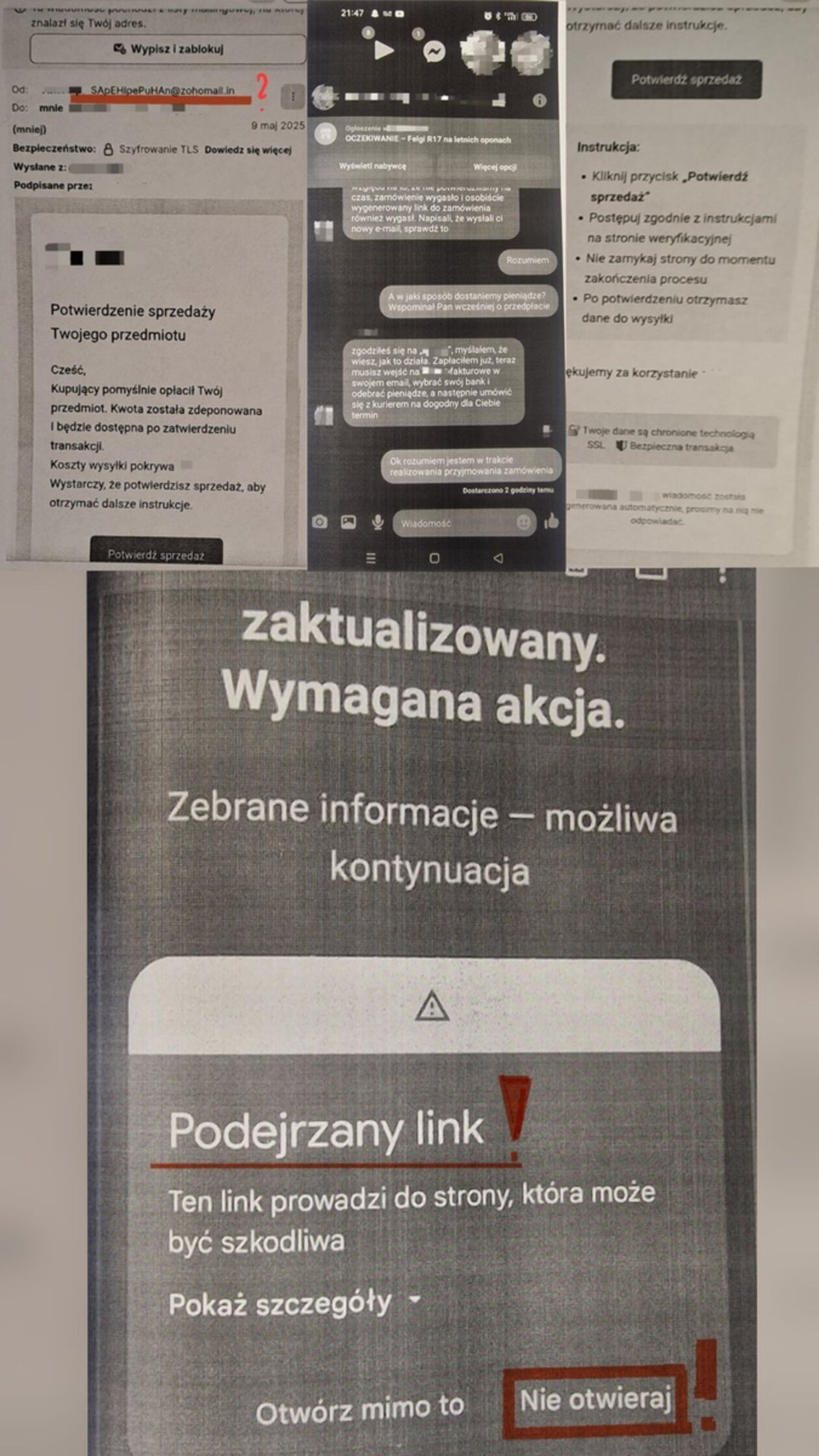 Druga poszkodowana, 52-letnia kobieta, została oszukana przy sprzedaży sukienki. W trakcie transakcji kliknęła w link przekierowujący do fałszywej strony banku, gdzie podała dane swojej karty. Dodatkowo, pod wpływem rozmowy z „konsultantem”, zatwierdziła kody BLIK. Straciła w ten sposób blisko 4 tysiące złotych.