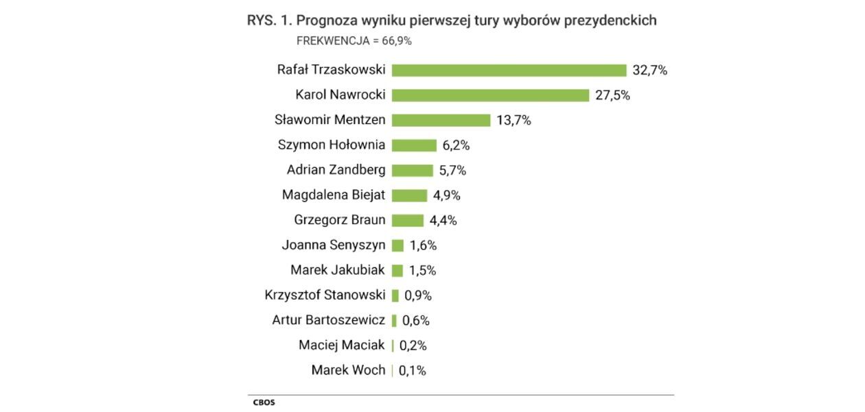 Ankieterzy o polityczne poparcie zapytali obywateli w dniach 5-14 maja w ramach dwóch niezależnych badań. Użyto wywiadów telefonicznych oraz internetowych na dwóch grupach liczących ponad tysiąc osób każda. Według przedstawionej prognozy wyników pierwszej tury wyborów z 18 maja, najlepszy wynik osiągnął Rafał Trzaskowski (32,7 proc.), którzy wyprzedza Karola Nawrockiego (27,5 proc.) oraz Sławomira Mentzena (13,7 proc.).